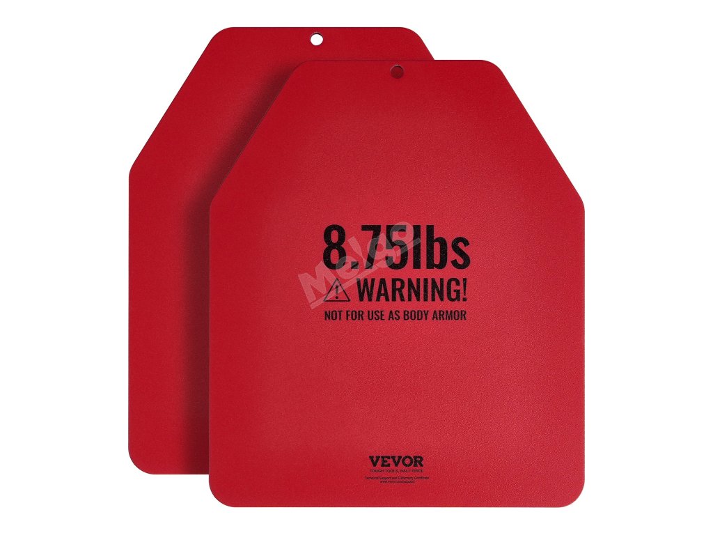 Tyto zátěžové desky jsou vyrobeny z odolné oceli se zaoblenými rohy a hladkými hranami a jsou konstruovány na dlouhou dobu. Pro větší ochranu jsou zabaleny do tří vrstev bublinkové fólie. Poznámka: Nejsou určeny k použití jako neprůstřelné vesty.