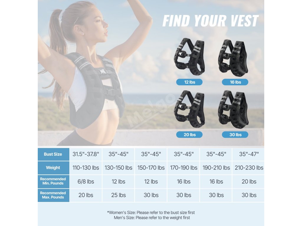 Tato zátěžová vesta pro muže a ženy se díky dvěma nastavitelným přezkám přizpůsobí velikosti poprsí od 35" do 45" (89-114 cm), čímž zajistí pevné a bezpečné uchycení pro všechny typy postav.