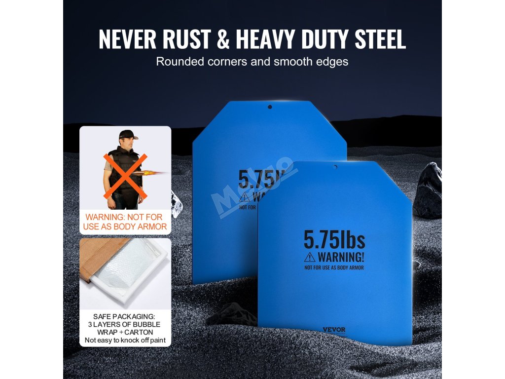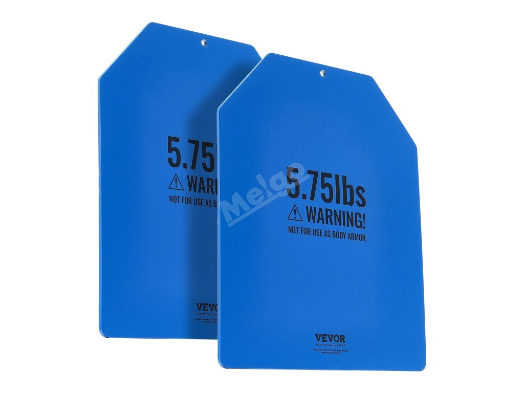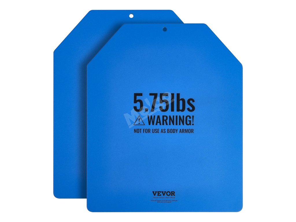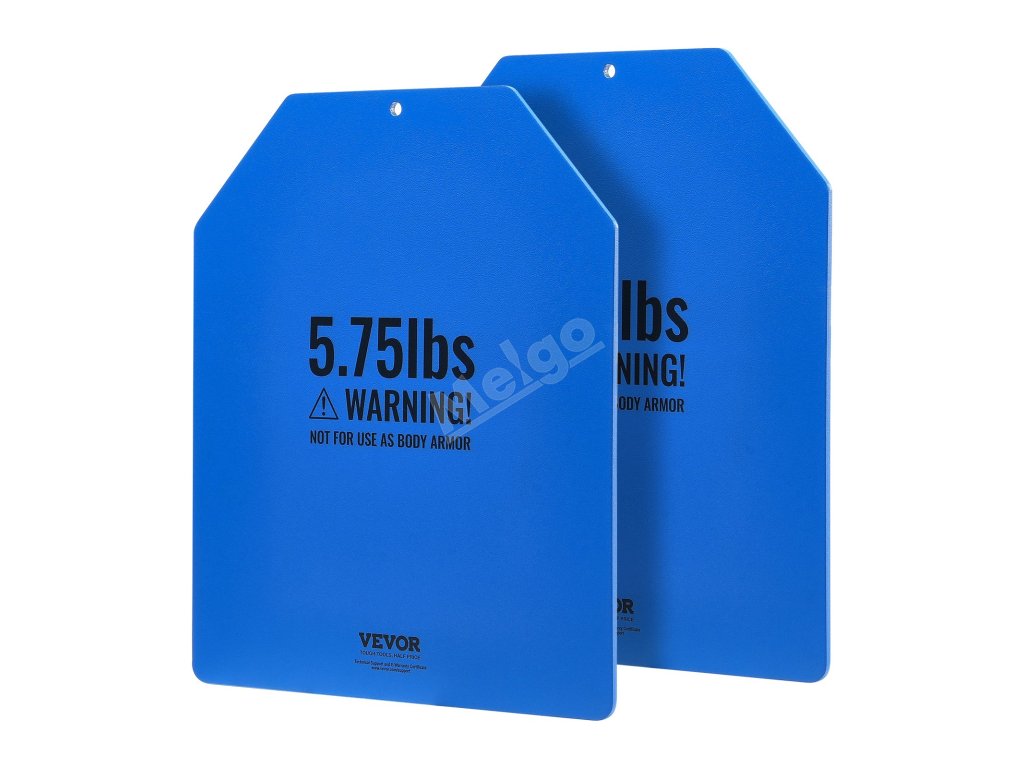 Tyto zátěžové desky jsou vyrobeny z odolné oceli se zaoblenými rohy a hladkými hranami a jsou konstruovány na dlouhou dobu. Pro větší ochranu jsou zabaleny do tří vrstev bublinkové fólie. Poznámka: Nejsou určeny k použití jako neprůstřelné vesty.