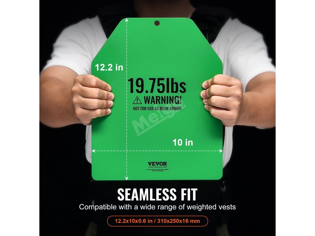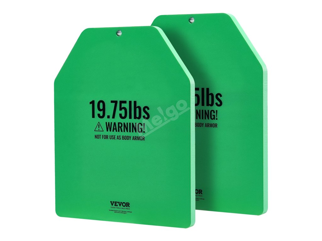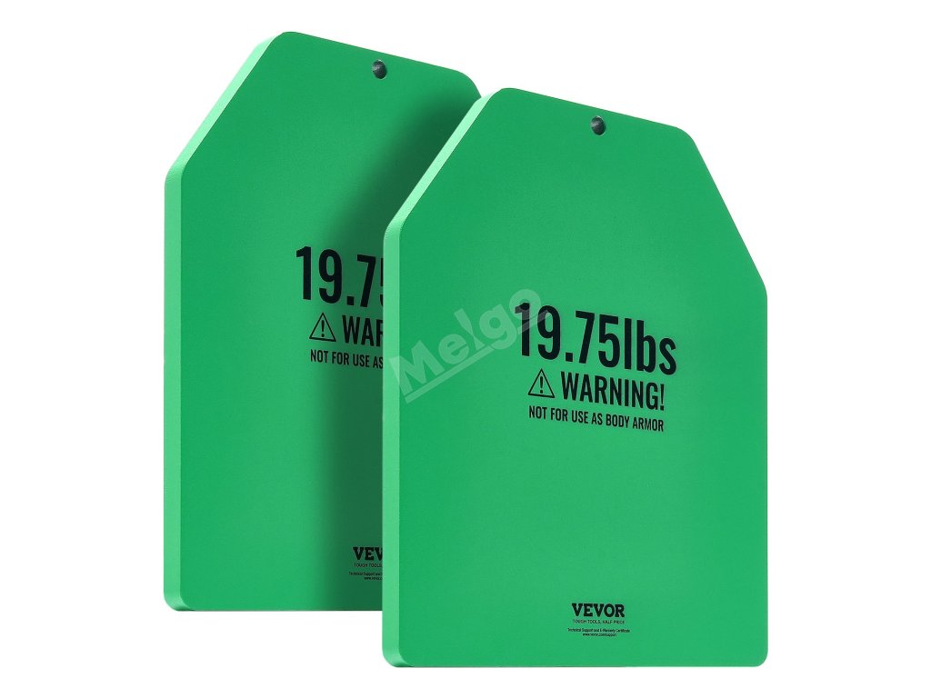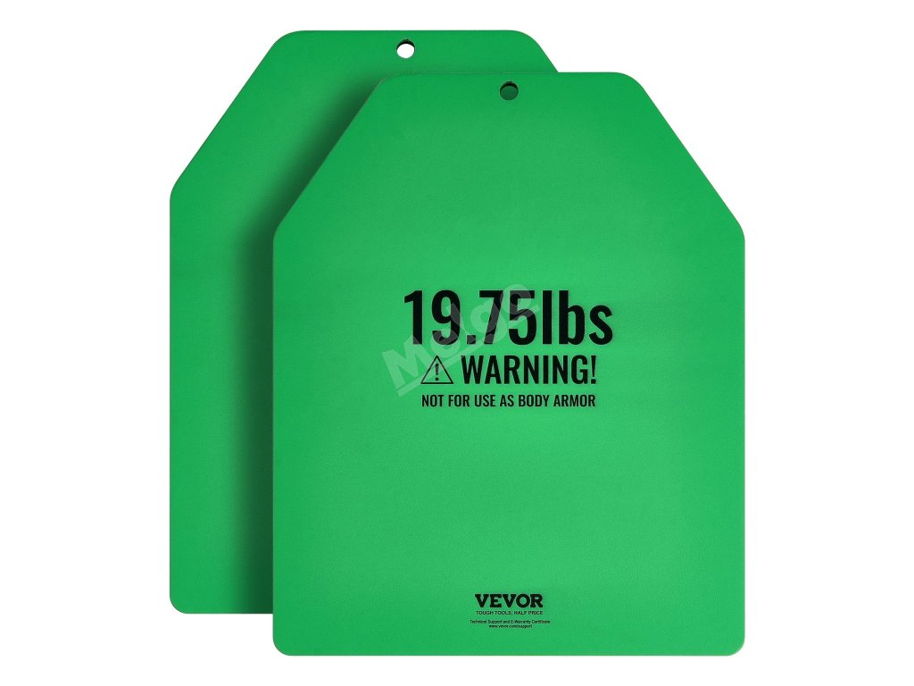 Tyto zátěžové desky jsou vyrobeny z odolné oceli se zaoblenými rohy a hladkými hranami a jsou konstruovány na dlouhou dobu. Pro větší ochranu jsou zabaleny do tří vrstev bublinkové fólie. Poznámka: Nejsou určeny k použití jako neprůstřelné vesty.