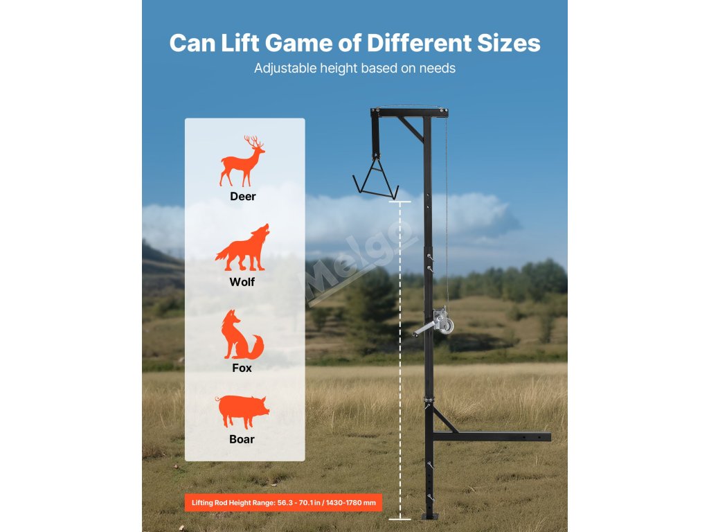 Tento ruční herní zvedák nabízí stabilní oporu a zvedne až 600 kg hry. Je vyroben z odolné uhlíkové oceli Q235 s korozivzdornou povrchovou úpravou a je ideální pro lov v přírodě, zemědělské práce a zvedání těžkých předmětů, a to i v oblastech bez elektrické energie. Snadno se čistí a udržuje.