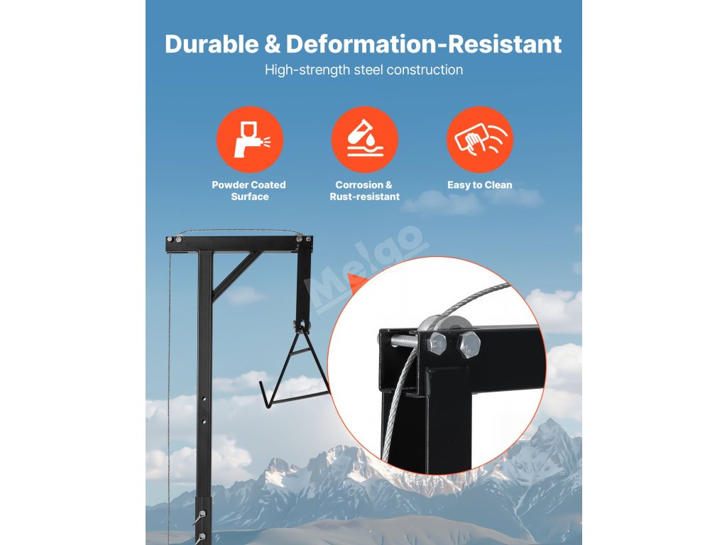 Závěs na jelena je ideální pro lov, pomáhá při zvedání, čištění a stahování kůže zvěře. Je vhodný také pro použití na farmách při zavěšování krmiva a dalších těžkých zvedacích pracích.