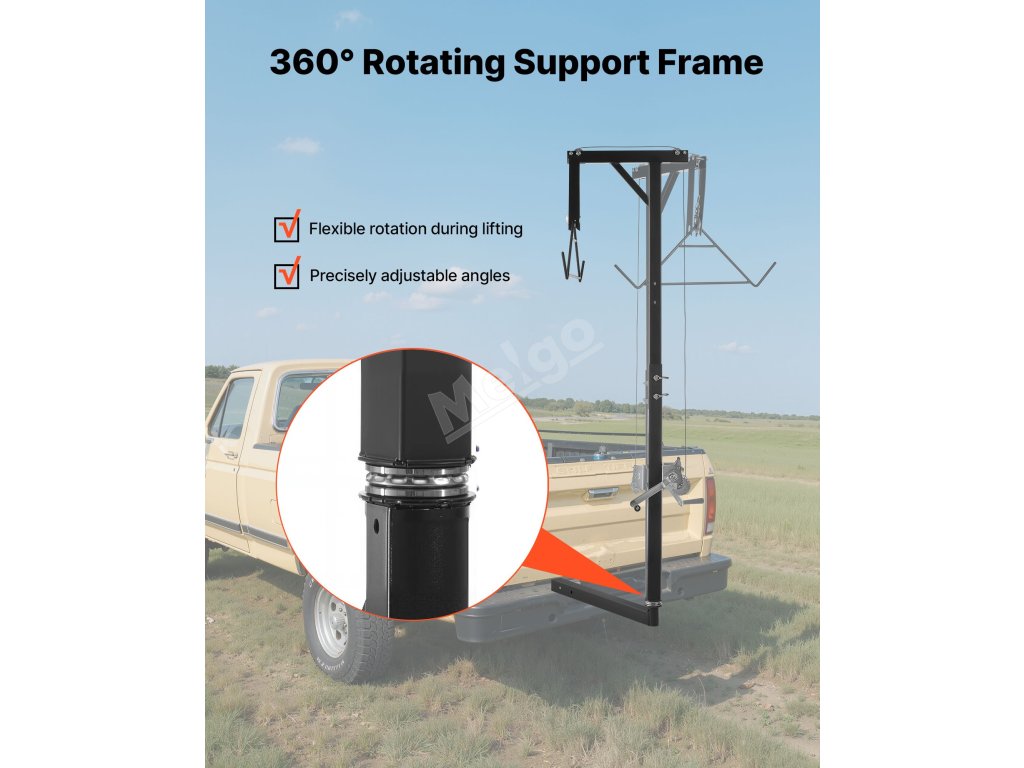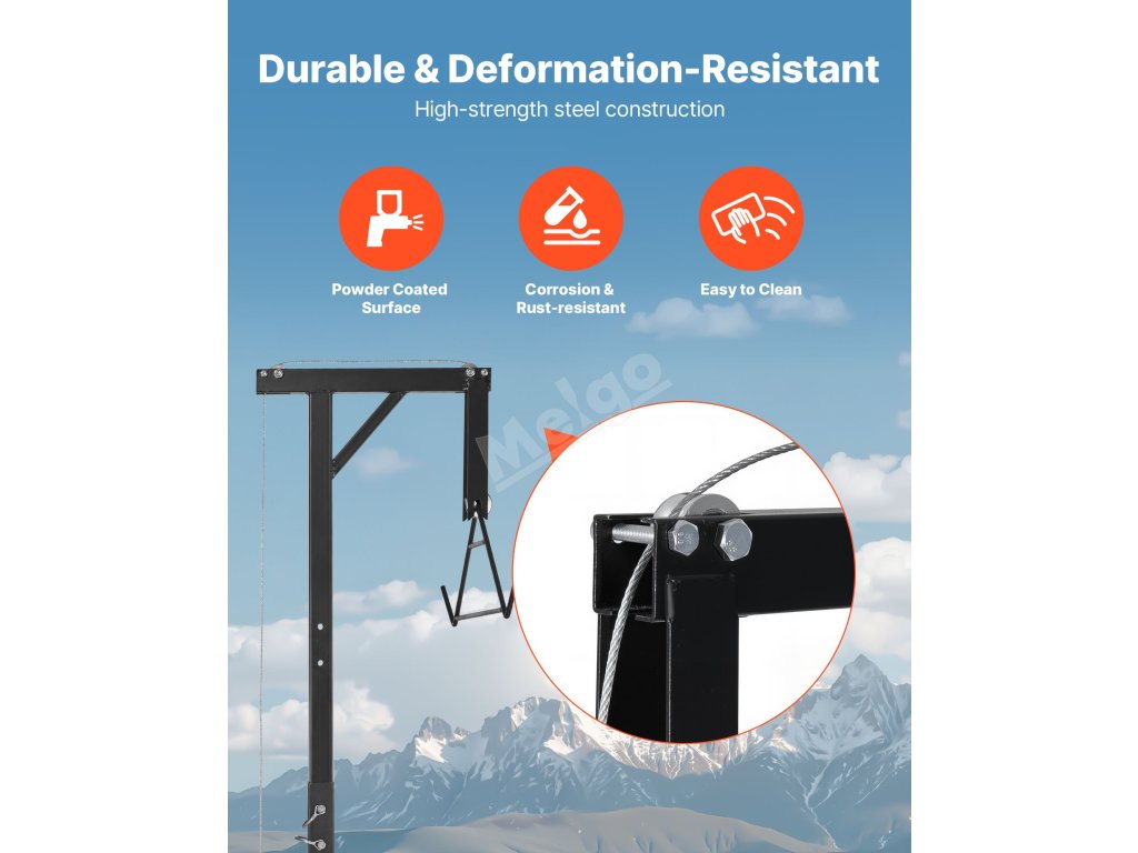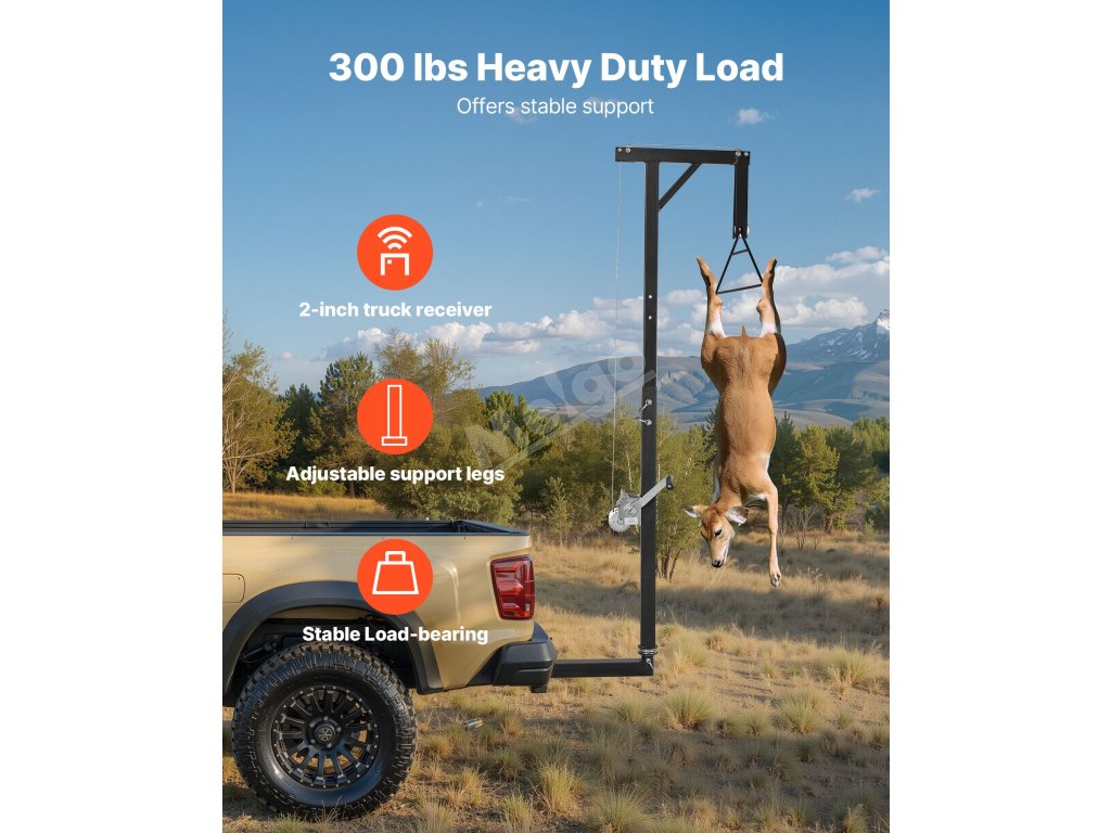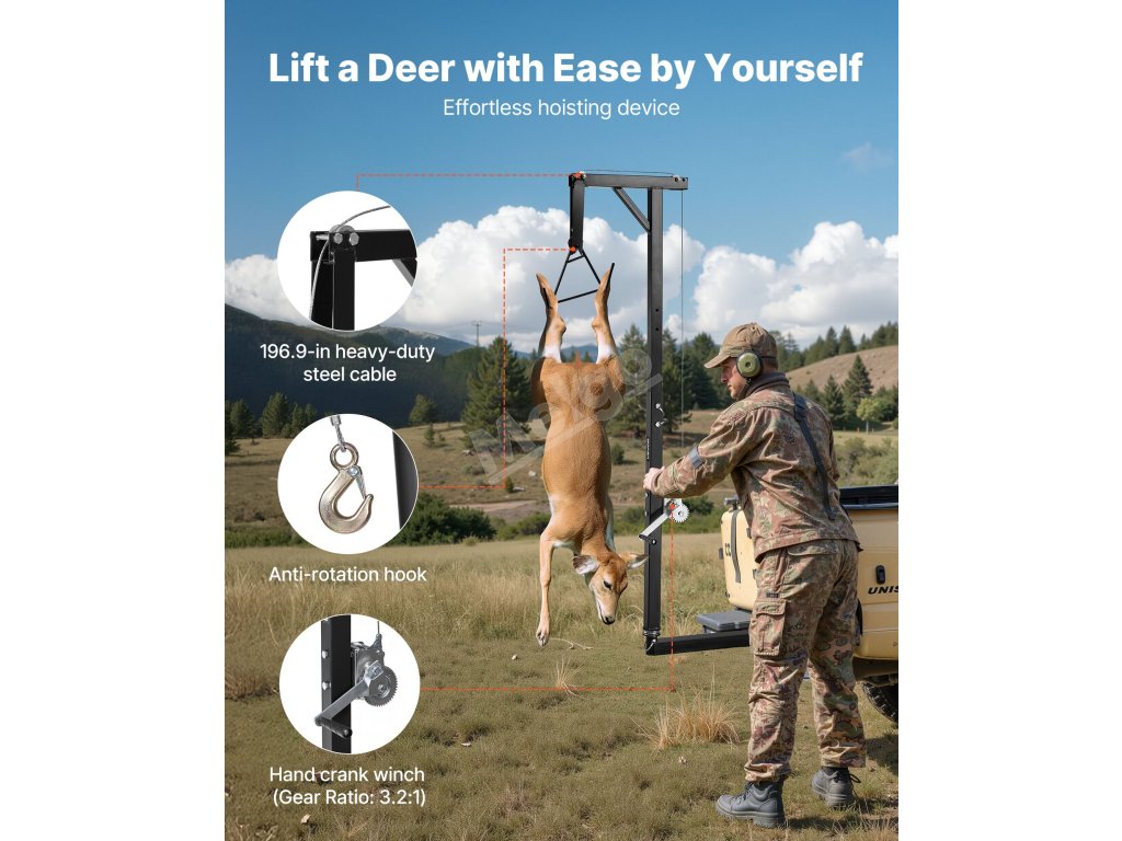 Závěs na jelena je ideální pro lov, pomáhá při zvedání, čištění a stahování kůže zvěře. Je vhodný také pro použití na farmách při zavěšování krmiva a dalších těžkých zvedacích pracích.