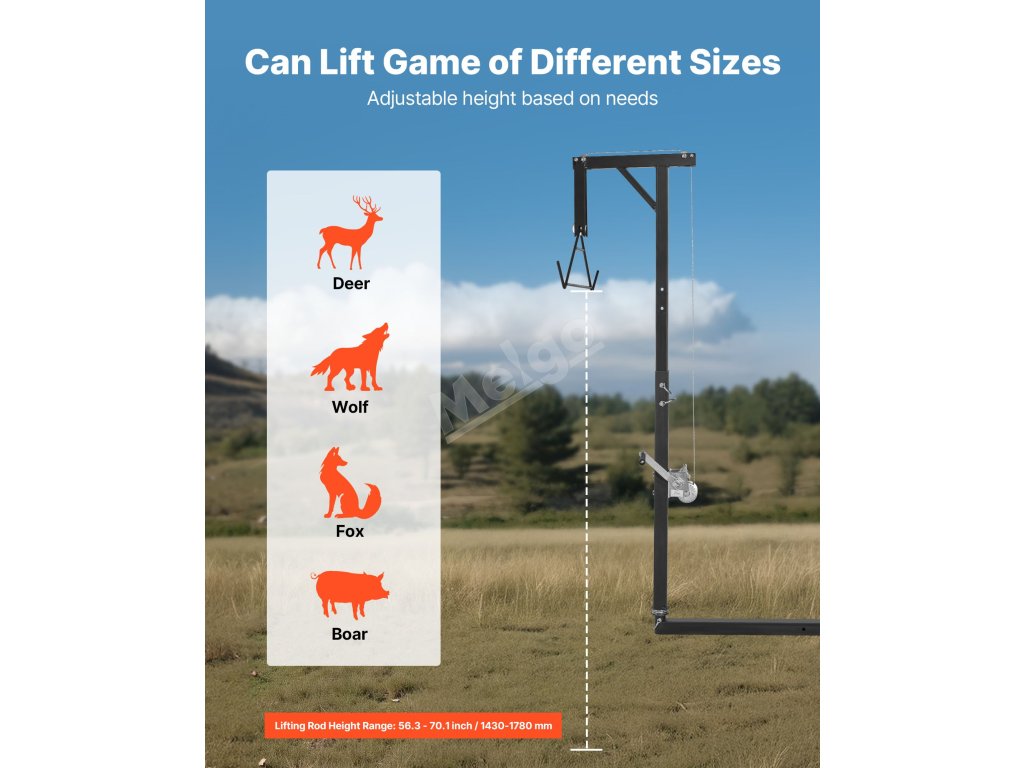 Tento ruční herní zvedák nabízí stabilní oporu a zvedne až 300 kg hry. Je vyroben z odolné uhlíkové oceli Q235 s korozivzdornou povrchovou úpravou a je ideální pro lov v přírodě, zemědělské práce a zvedání těžkých předmětů, a to i v oblastech bez elektrické energie. Snadno se čistí a udržuje.