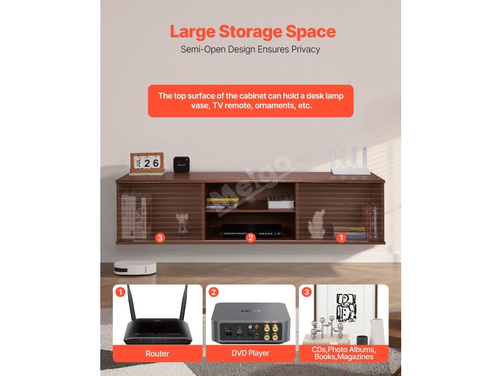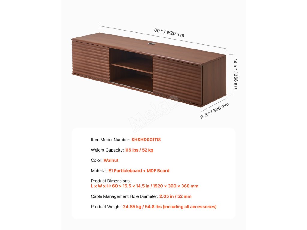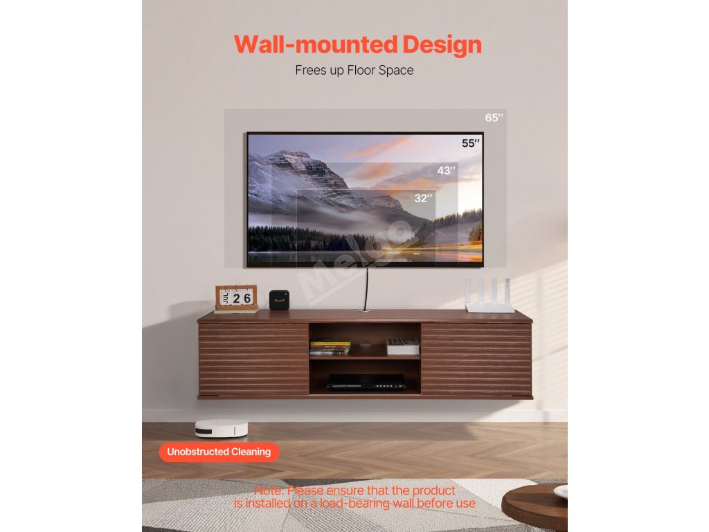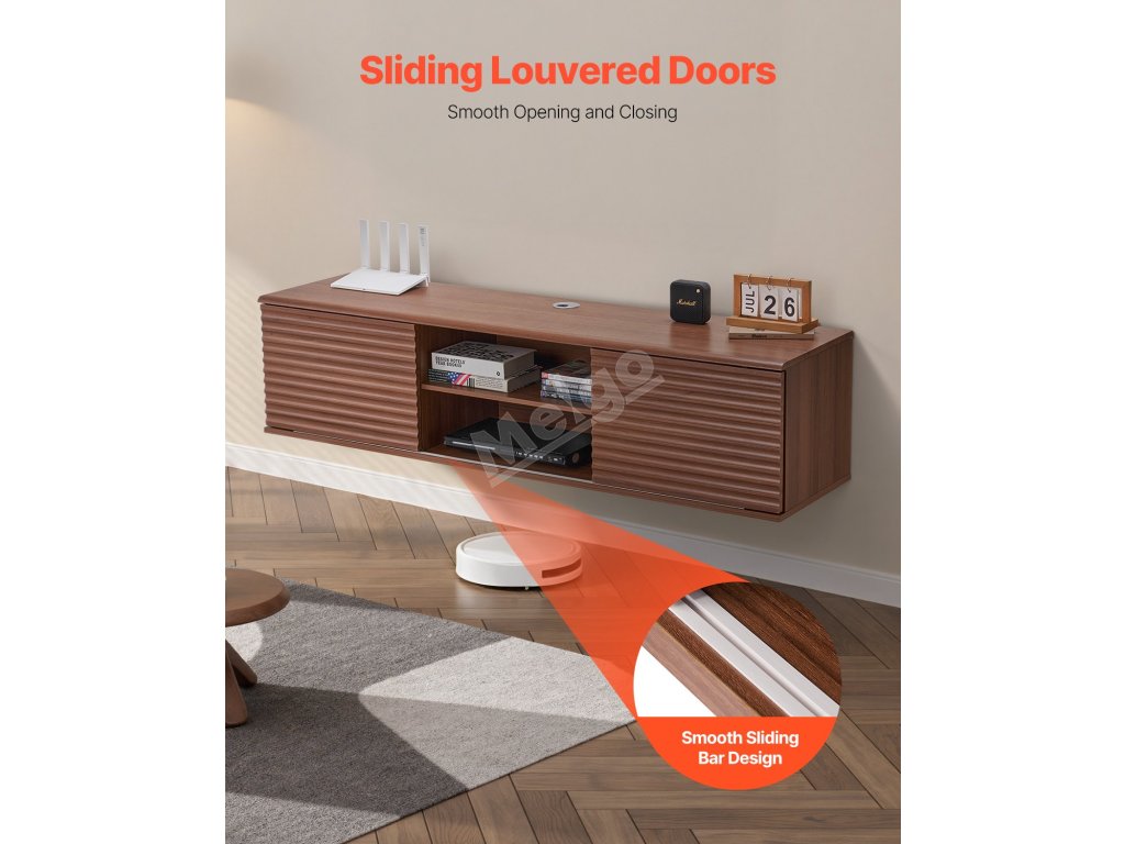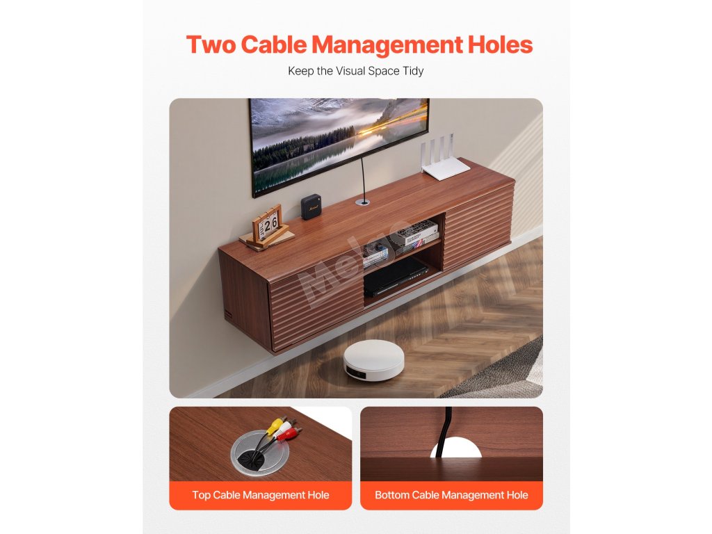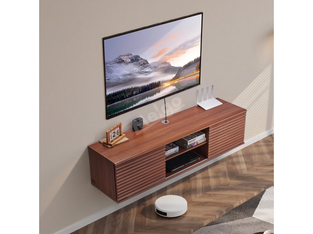 Tento plovoucí televizní stolek s nastavitelným panelem ve tvaru vlny má dvoje posuvné lamelové dveře, které poskytují přehledný úložný prostor pro router, herní konzole a další předměty. Dva otvory pro kabely jsou navrženy tak, aby schovaly kabely, udržovaly vše uklizené a zvýšily vizuální přitažlivost vašeho prostoru.