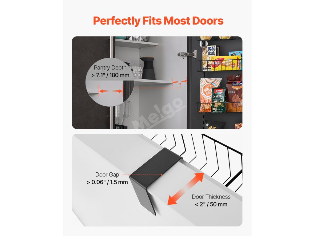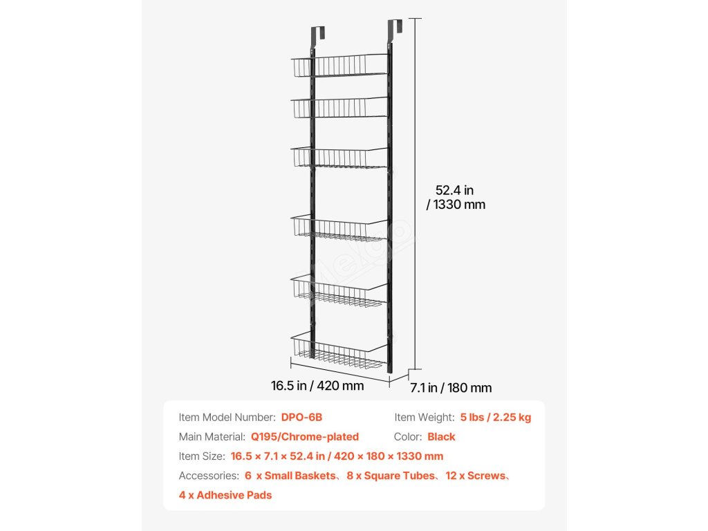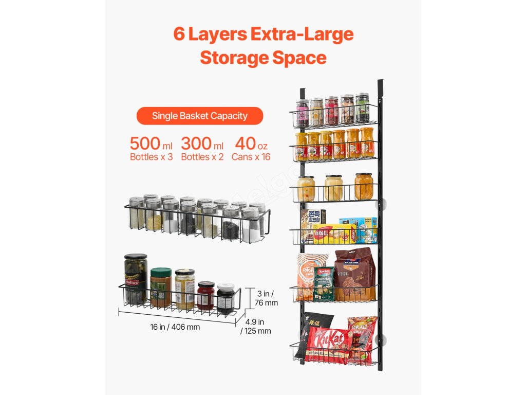 Tento organizér do špajze nad dvere obsahuje 6 veľkých košov, ktoré maximalizujú vašu úložnú kapacitu! Môžete ho použiť ako organizér na dvere špajze, stojan na korenie alebo organizér na skladovanie v skrini - ideálny pre malé priestory.