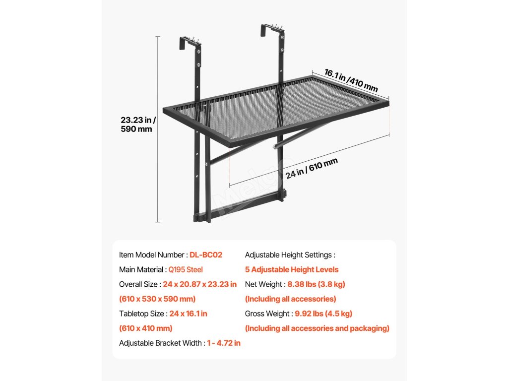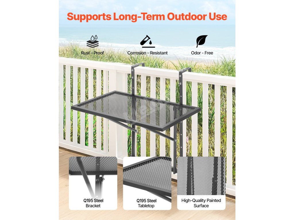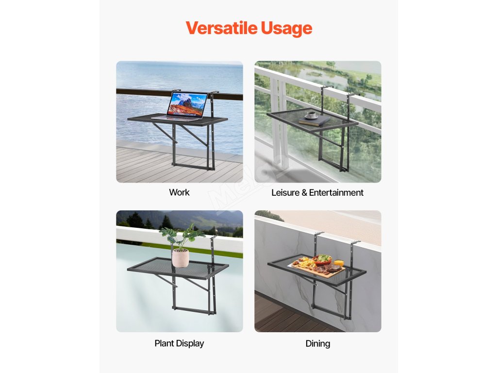 Tento závěsný balkonový stolek je navržen s ohledem na flexibilitu a má nastavitelnou výšku, aby se přizpůsobil různým preferencím uživatelů a různým venkovním scénářům. Ať už slouží k práci, stolování nebo odpočinku, je dokonalým doplňkem každého balkonu nebo terasy.