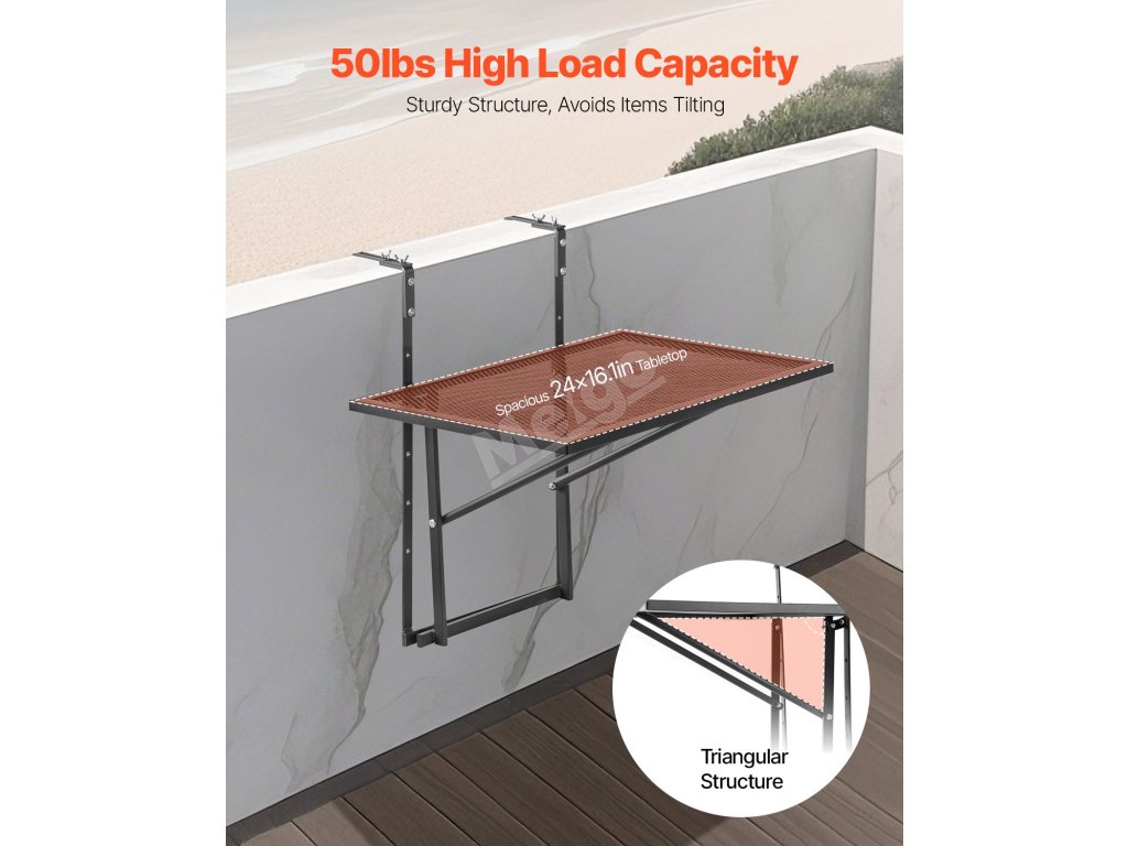 Tento skládací balkonový stůl s trojúhelníkovou konstrukcí, vyrobený z nerezové oceli a nerezových konzol, zaručuje stabilitu a neprohýbá se ani při dlouhodobém používání. Je vybaven příslušenstvím pro snadnou instalaci. Není třeba měřit úhel, hodí se k různým typům zábradlí.