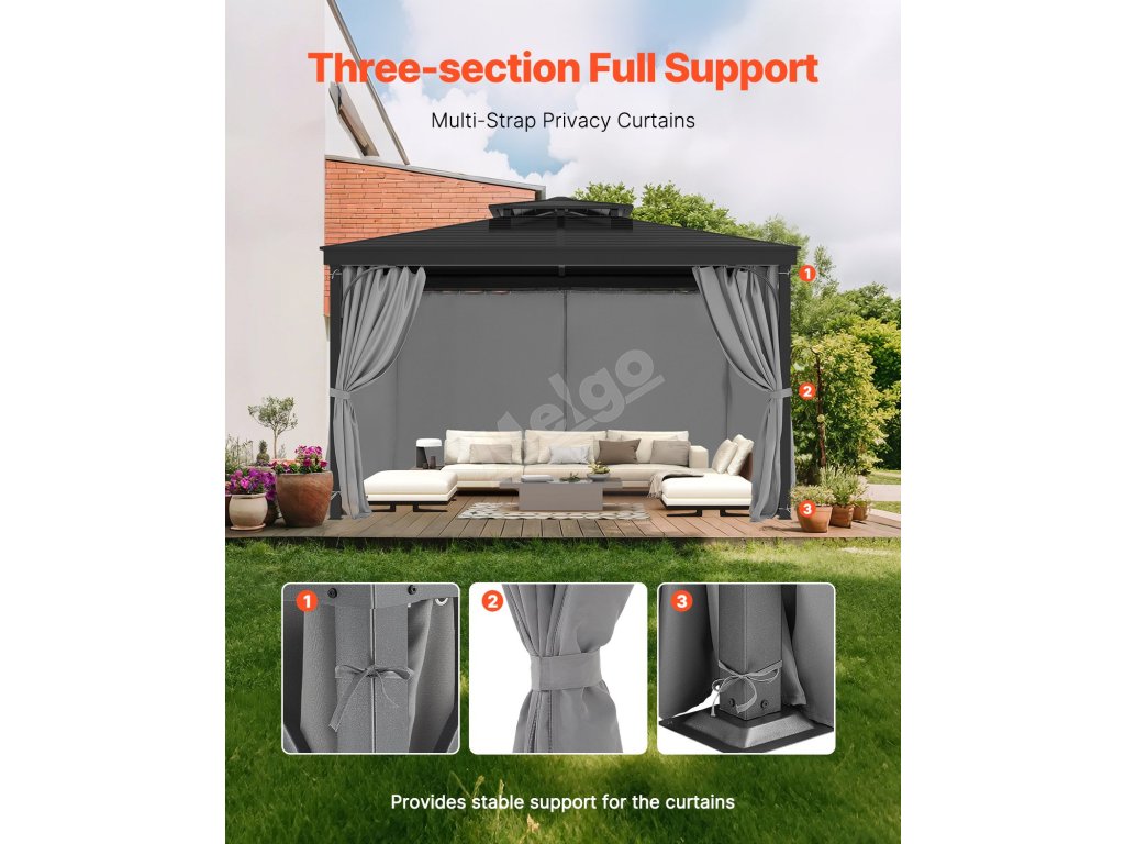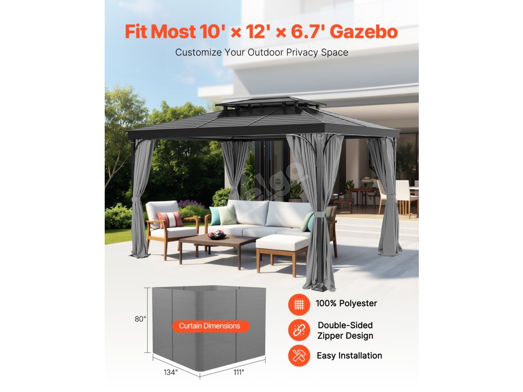 Tento odolný závěs je určen pro altány o rozměrech 10' x 12' x 6,7' a je vyroben z voděodolného polyesteru o gramáži 160 g/m2, který chrání před sluncem. Oboustranný zip umožňuje snadné nastavení a hliníkové průchodky zajišťují rychlou instalaci. Třídílná konstrukce s vázáním poskytuje stabilní oporu pro vaše venkovní soukromí.
