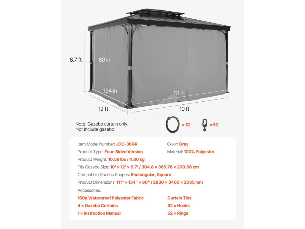 | Vhodné pro velikost altánu | 10' x 12' x 6,7' / 283 x 340 x 203,5 cm |