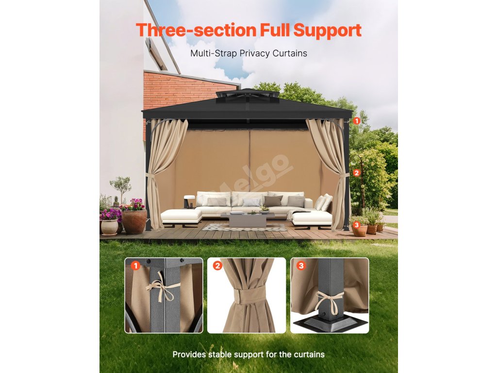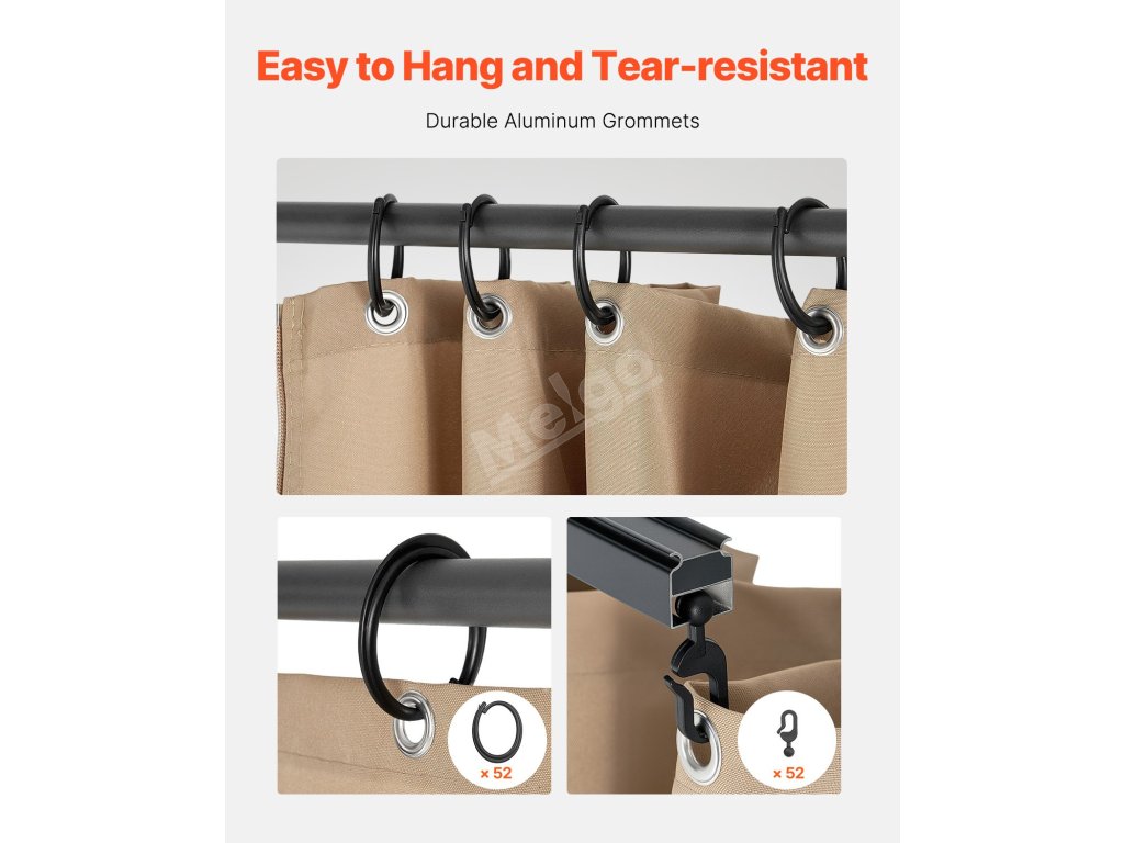 Tento odolný závěs je určen pro altány o rozměrech 10' x 12' x 6,7' a je vyroben z voděodolného polyesteru o gramáži 160 g/m2, který chrání před sluncem. Oboustranný zip umožňuje snadné nastavení a hliníkové průchodky zajišťují rychlou instalaci. Třídílná konstrukce s vázáním poskytuje stabilní oporu pro vaše venkovní soukromí.