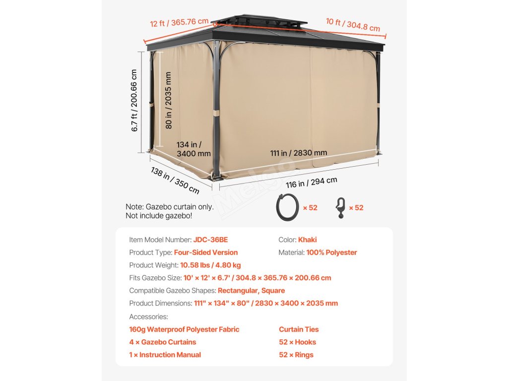 | Vhodné pro velikost altánu | 10' x 10' x 6,9' / 284 x 284 x 211 cm |