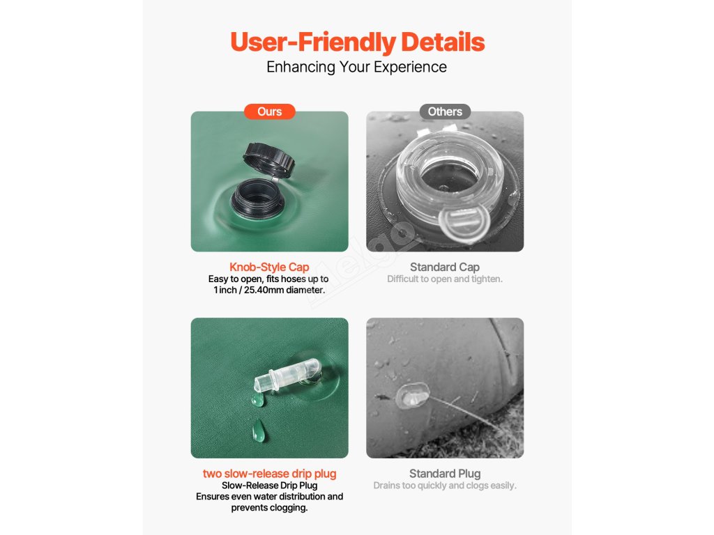 Odvodňovací otvor je vybaven pomalu se uvolňujícím odkapávacím ventilem pro rovnoměrnou distribuci vody bez ucpávání, který zajišťuje stabilní přísun vlhkosti. Díky konstrukci s dvojitým madlem se vak snadno přenáší a instaluje.