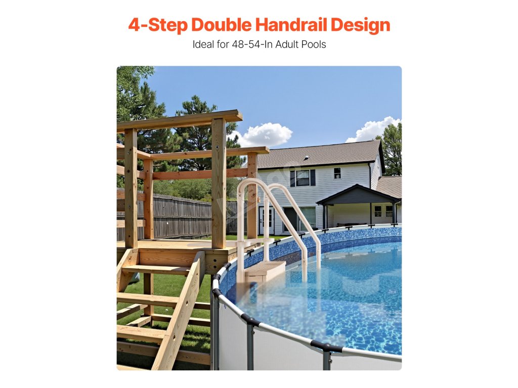 Náš čtyřstupňový bazénový žebřík s dvojitým zábradlím nabízí stabilní a bezpečný vstup a výstup z bazénu. S nosností až 400 kg je vhodný pro uživatele všech velikostí. Instalace je snadná a hladká madla zajišťují pevné uchopení. Díky své dlouhodobé stabilitě je tento žebřík jistotou pro vnitřní i venkovní bazény.