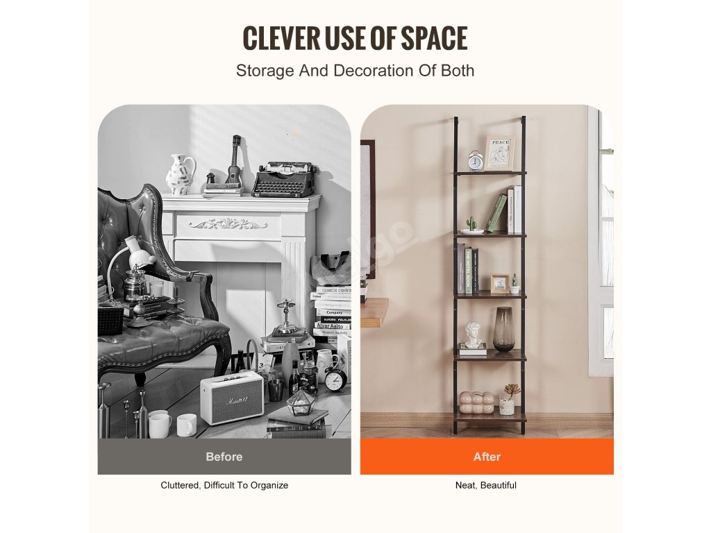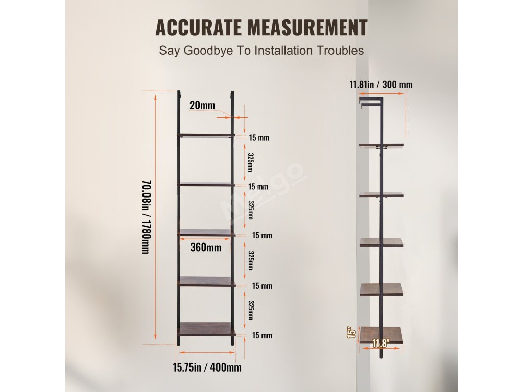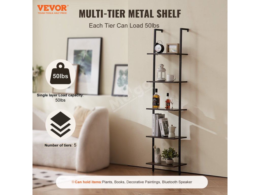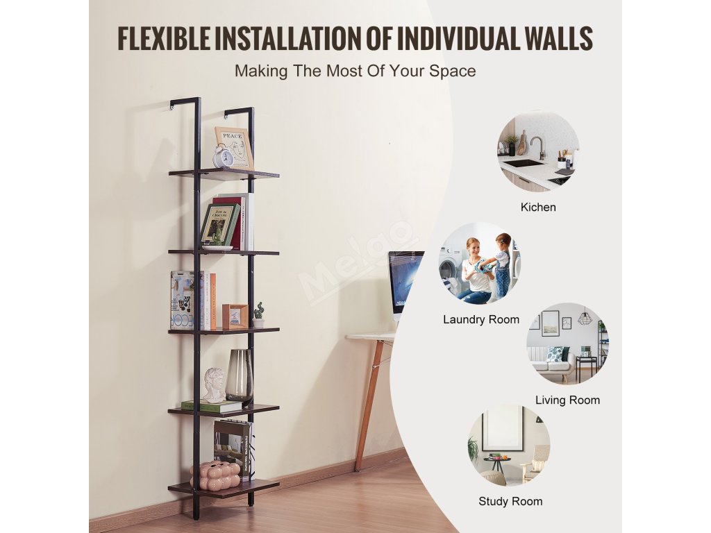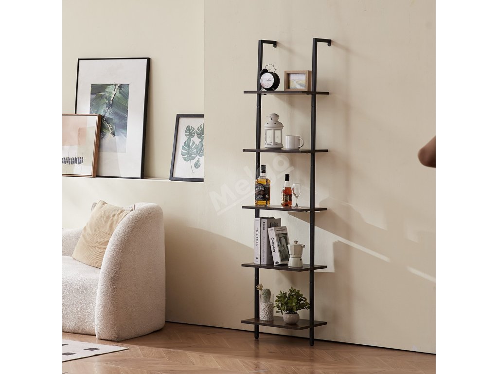 Žebříkový nástěnný regál 5 polic, otevřený, kovový rám, 15.6×11.8in
