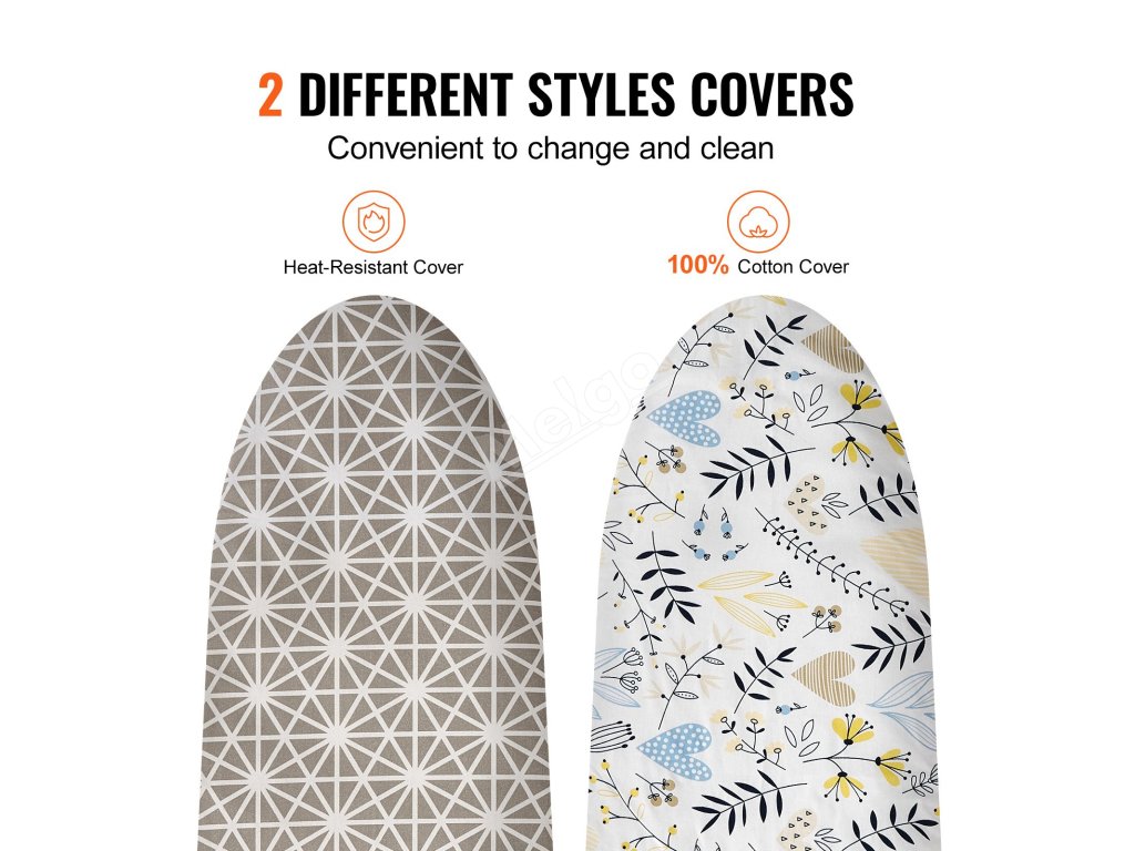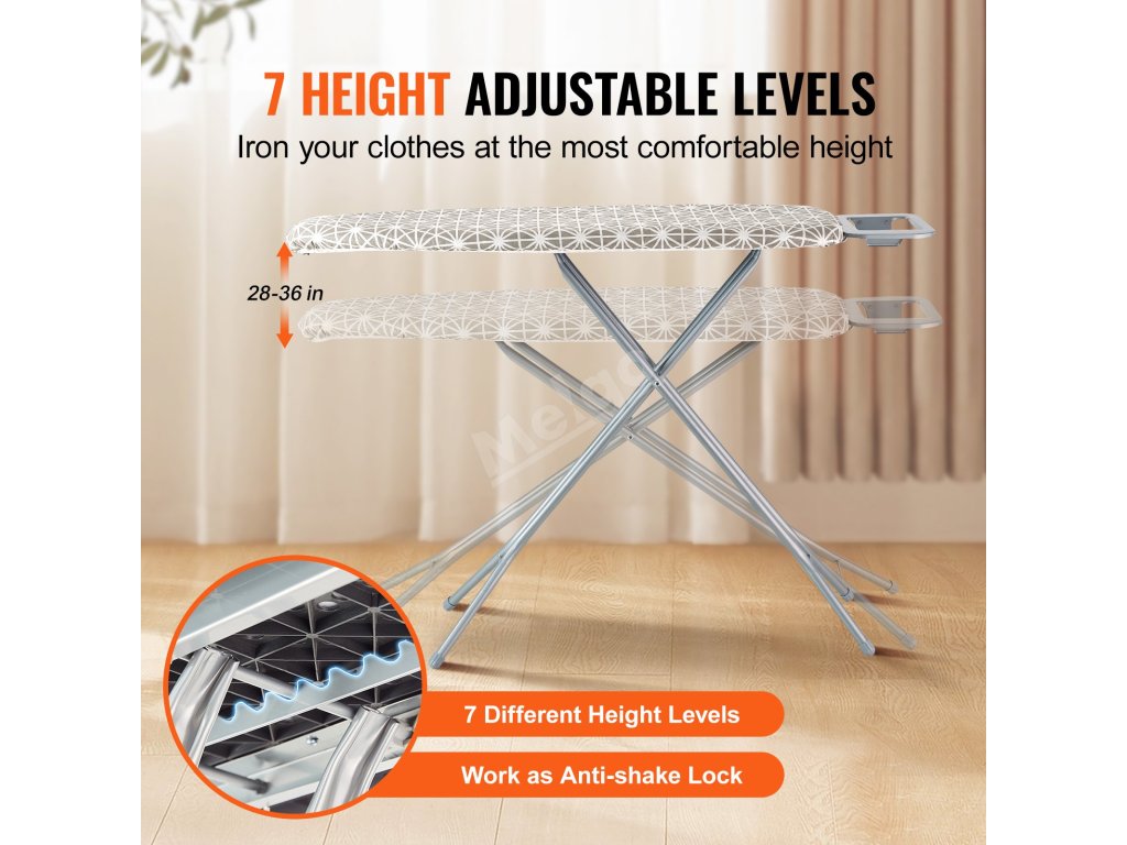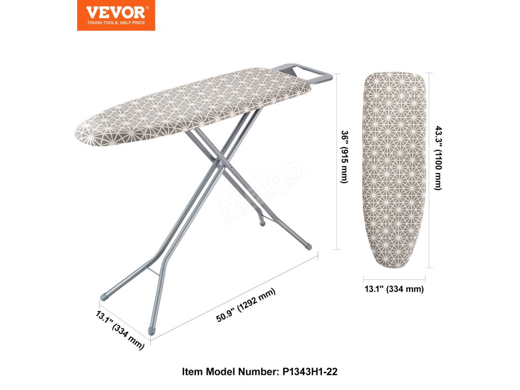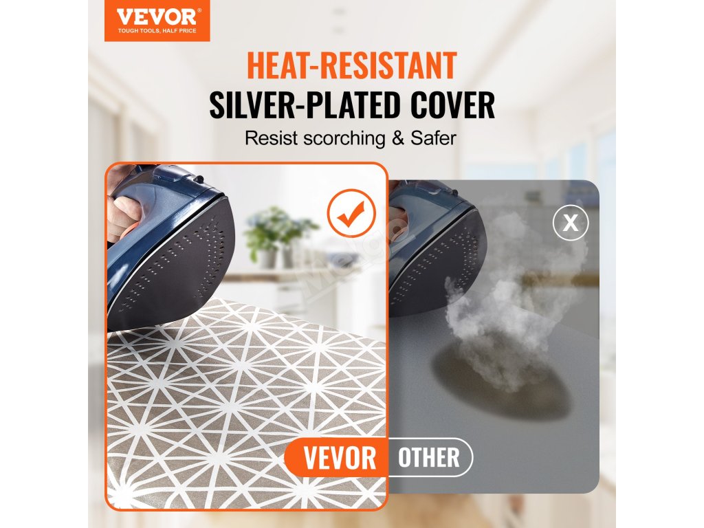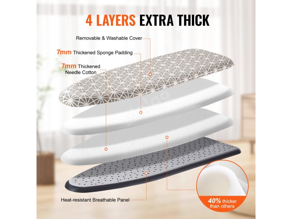 Žehlicí stůl VEVOR vyniká čtyřvrstvou konstrukcí. S odnímatelným potahem, 7 mm silnou vrstvou houbového polstrování, 7 mm silnou vrstvou jehlou děrované bavlny a tepelně odolným prodyšným panelem zajišťuje účinné odstraňování záhybů.