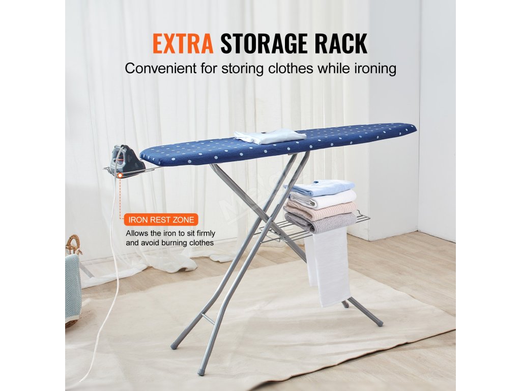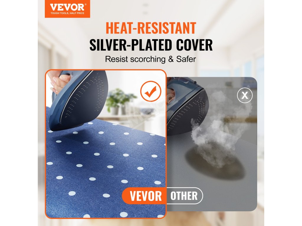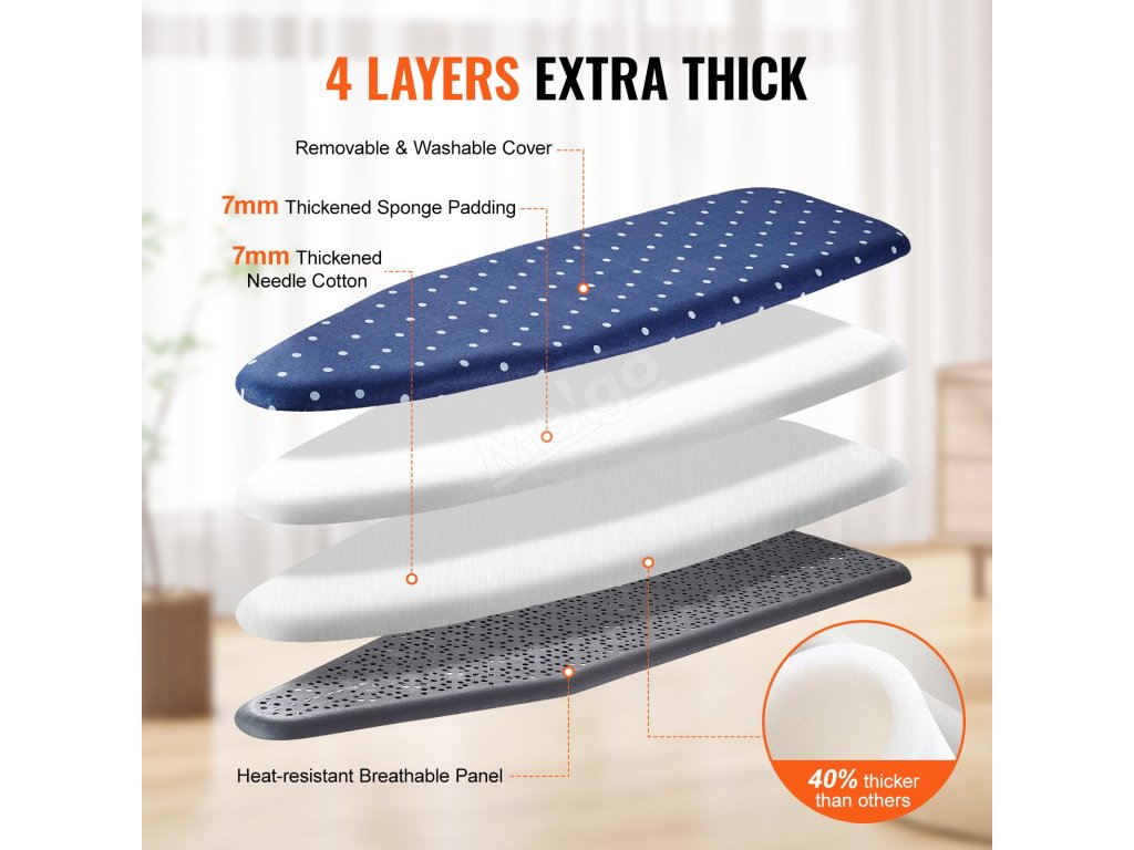 Žehlicí stůl VEVOR vyniká čtyřvrstvou konstrukcí. S odnímatelným potahem, 7 mm silnou vrstvou houbového polstrování, 7 mm silnou vrstvou jehlou děrované bavlny a tepelně odolným prodyšným panelem zajišťuje účinné odstraňování záhybů.