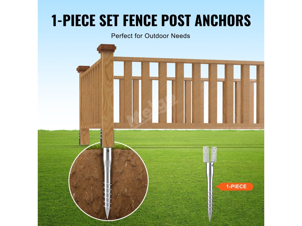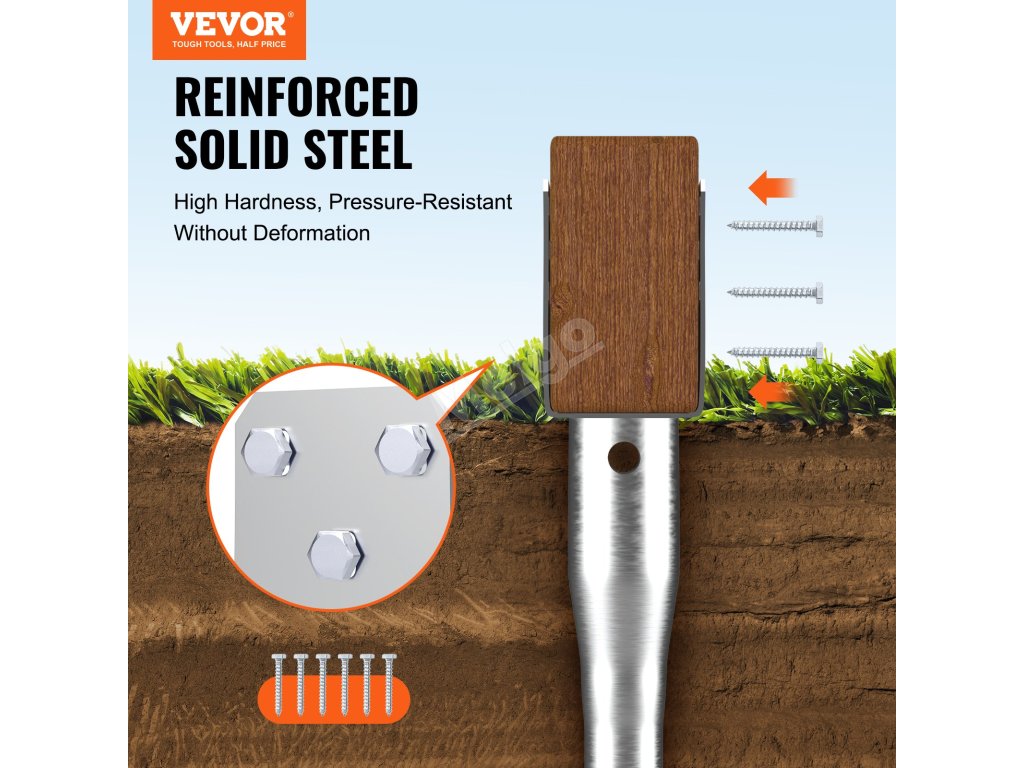 Instalace je jednoduchá - není potřeba žádný výkop ani cement. Umístěte hrot, přidejte dřevěný blok a zatlučte kladivem. Po několika úderech zkontrolujte, zda je hrot v rovině, zatlačte jej zcela do země a vyměňte jej za plotový sloupek.