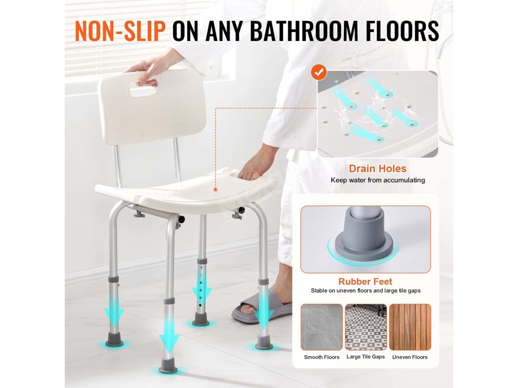 Užijte si bezpečné sezení v koupelně, ve sprše nebo ve vaně. Protiskluzové podložky pod nohy naší sprchové židle zvyšují tření a kontakt s podlahou, čímž snižují riziko dlouhého stání nebo uklouznutí při koupání. Díky netěsnícím otvorům bude odtokový efekt lepší.