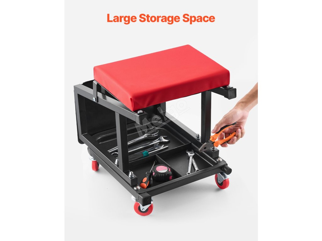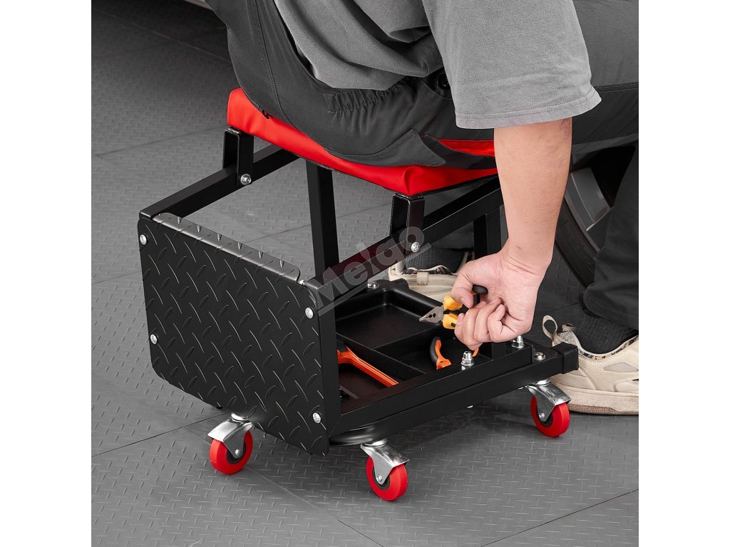 Naše sedačka pro opravy v garáži má odolný ocelový rám a zesílené šrouby s nosností 300 liber. Nabízí stabilitu, pohodlí a správnou výšku, takže můžete pracovat bez dlouhého ohýbání nebo klečení.