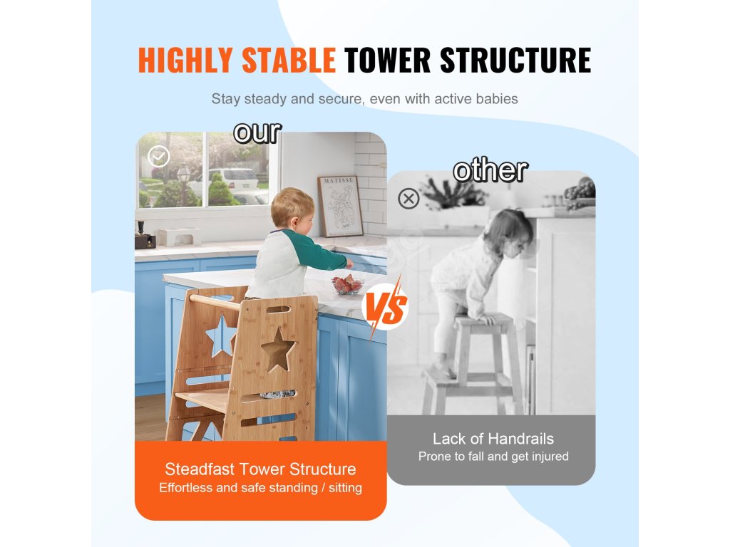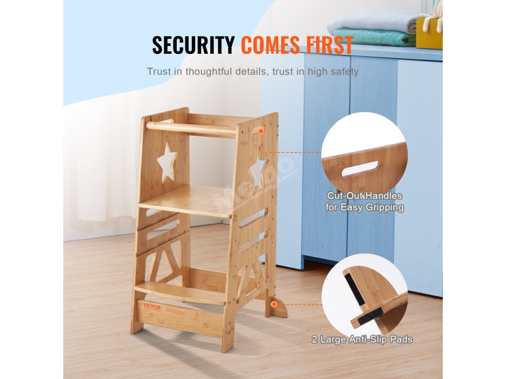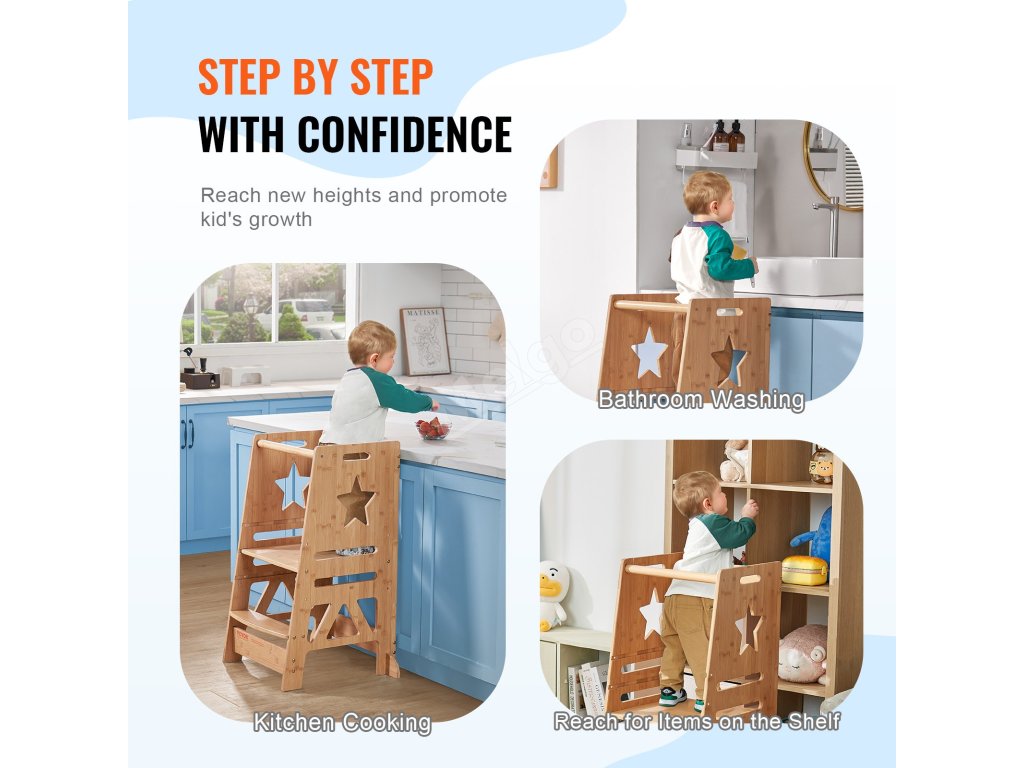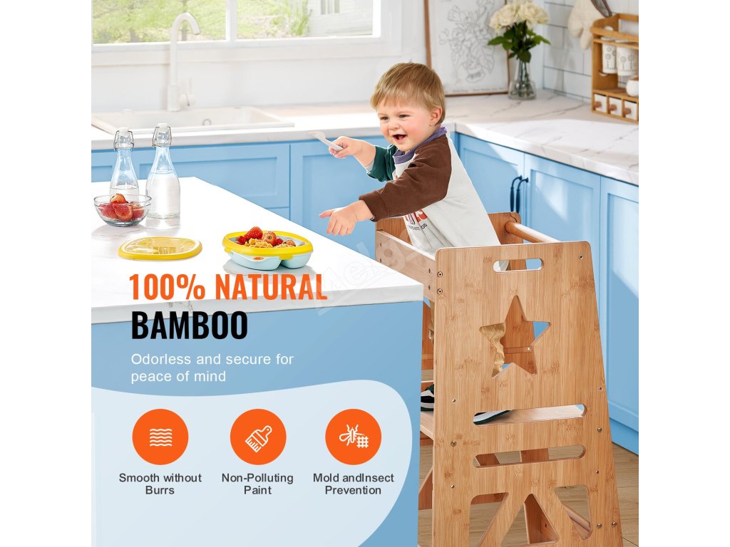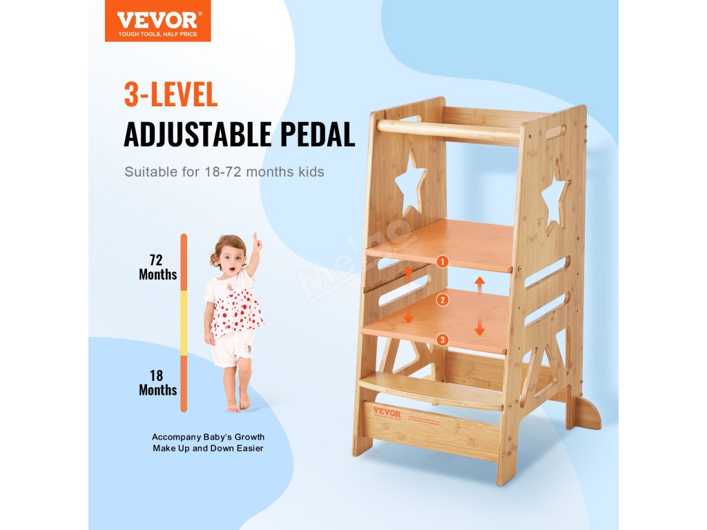 Odemkněte potenciál svého dítěte pomocí stupínku VEVOR pro batolata! Náš přírodní bambusový stupínek je branou, která podporuje samostatnost, objevování a růst vašeho dítěte. Nechte své děťátko snadno objevovat, vařit a dosahovat nových výšek: díky 3 nastavitelným výškám a nosnosti 350 liber.