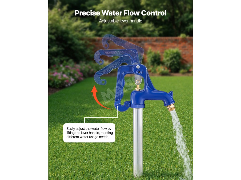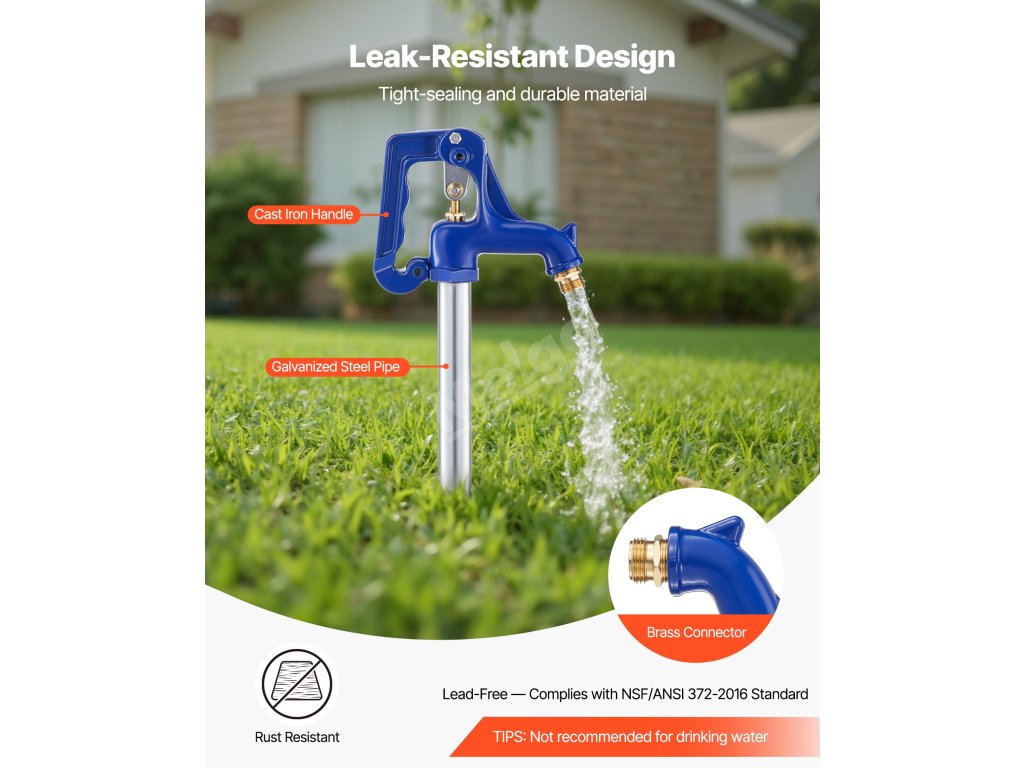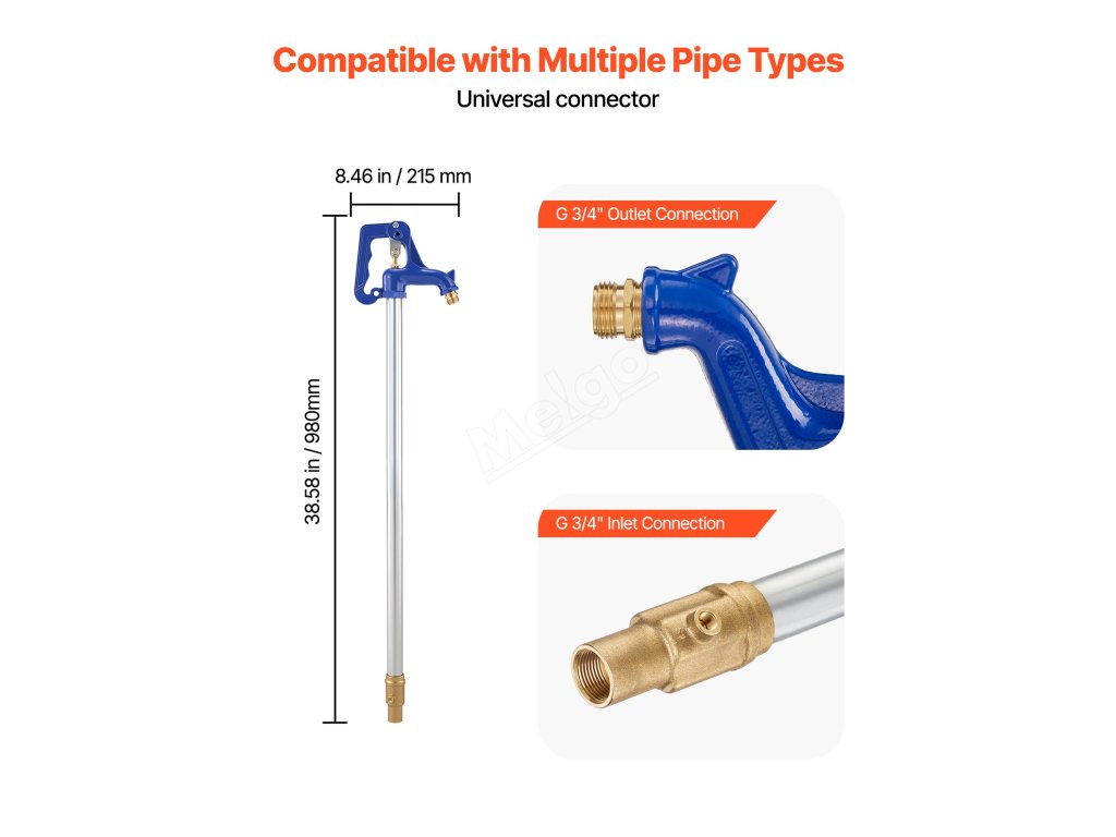 Mrazuvzdorný hydrant VEVOR má celkovou délku 3,22FT (980 mm), hloubku zakopání 12 palců a konstrukci obtokového ventilu, která umožňuje plynulý průtok vody i za mrazu. Odolná konstrukce snižuje únik vody a zajišťuje dlouhou životnost, je ideální pro zalévání zahrady, mytí auta a zavlažování farmy.