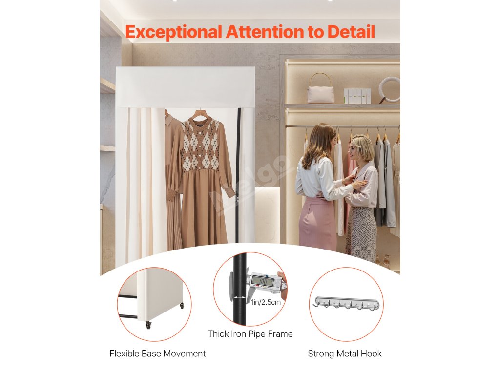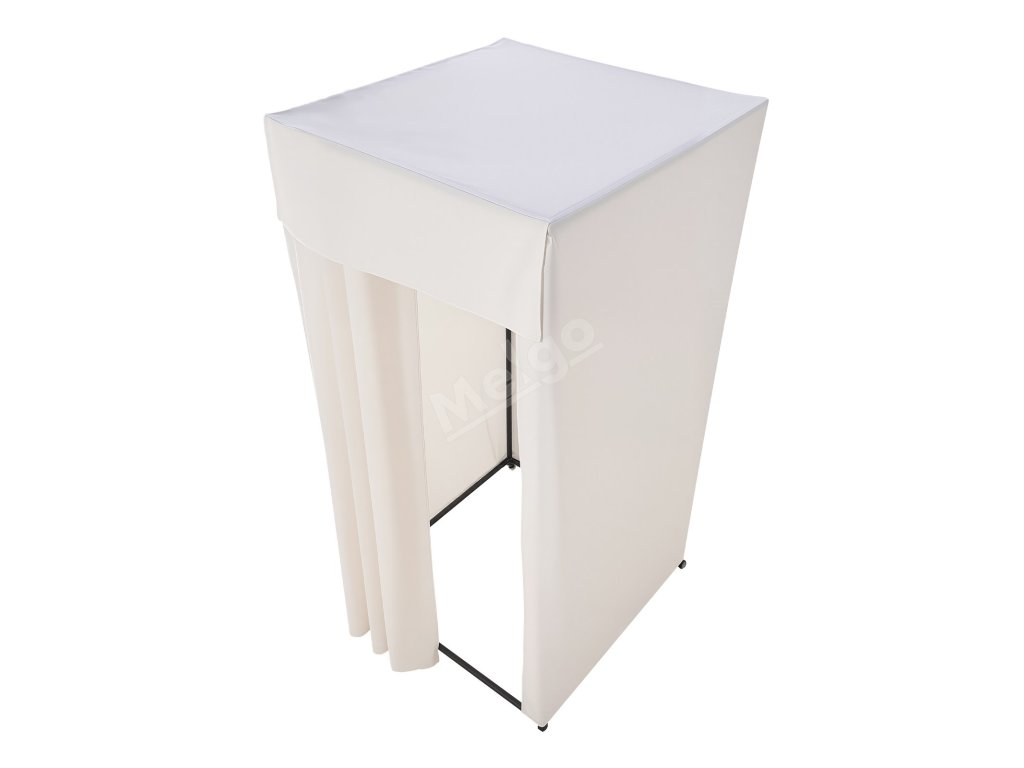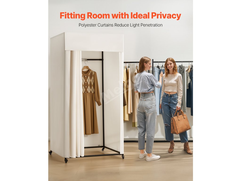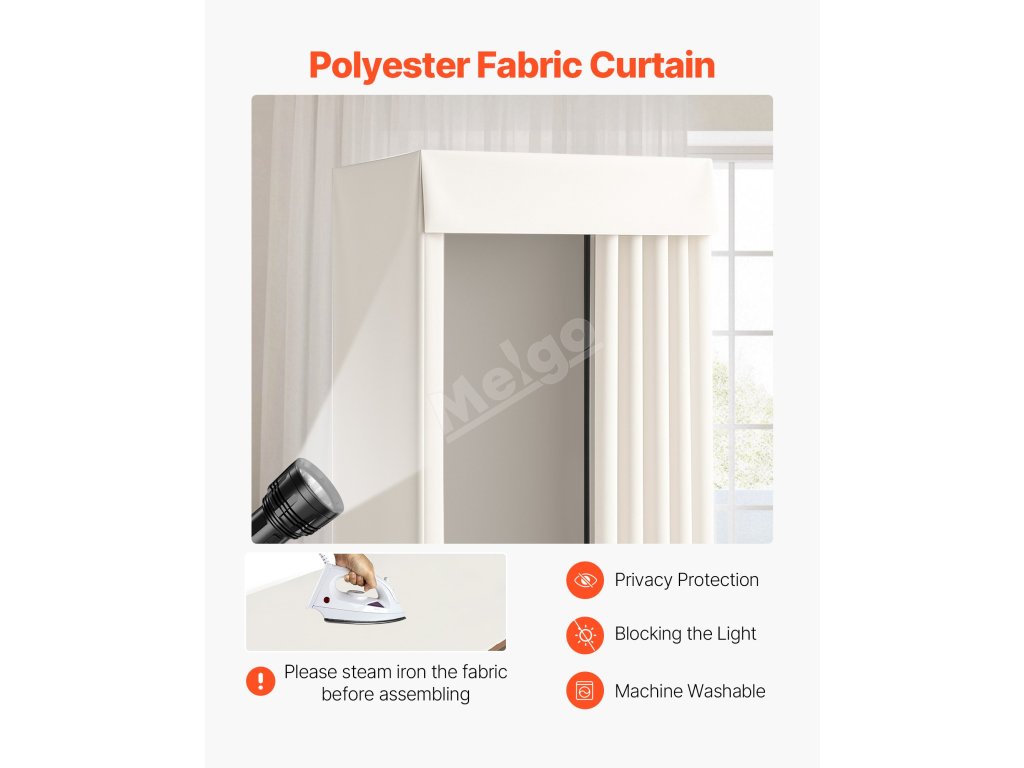 Je vyroben z polyesterové tkaniny, která blokuje světlo, zajišťuje soukromí a je odolná proti pomačkání. Robustní železný rám zajišťuje stabilitu a poskytuje bezpečný prostor pro převlékání, ideální pro obchodní centra, butiky, studia, obchody se svatebními šaty a další.
