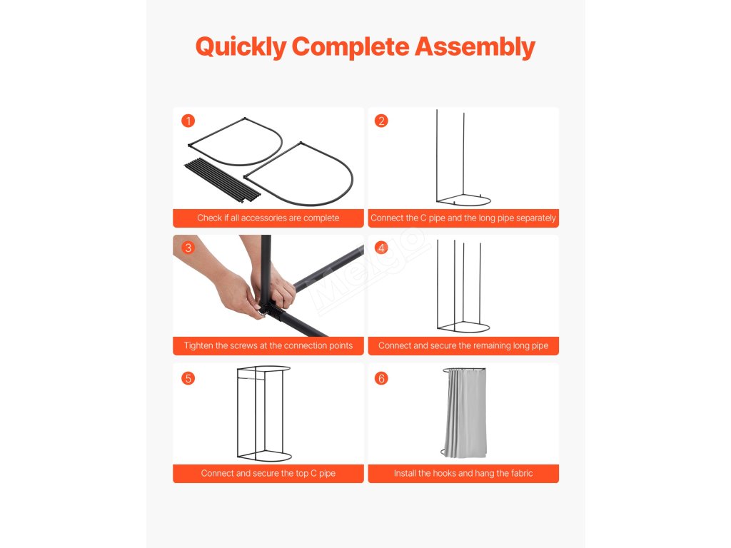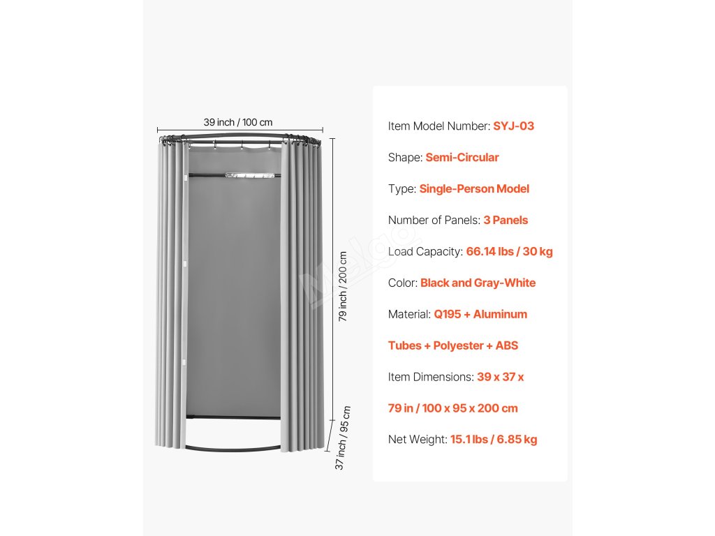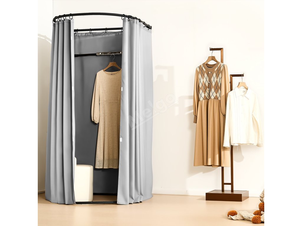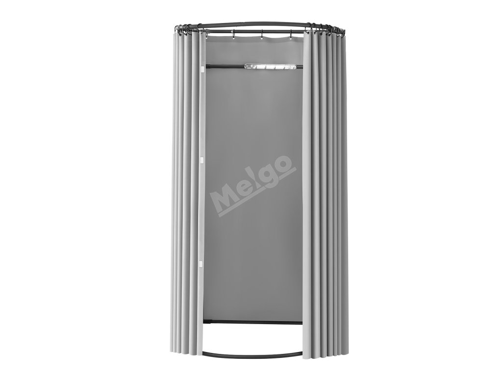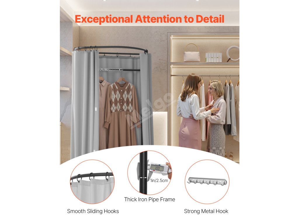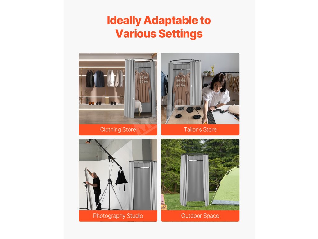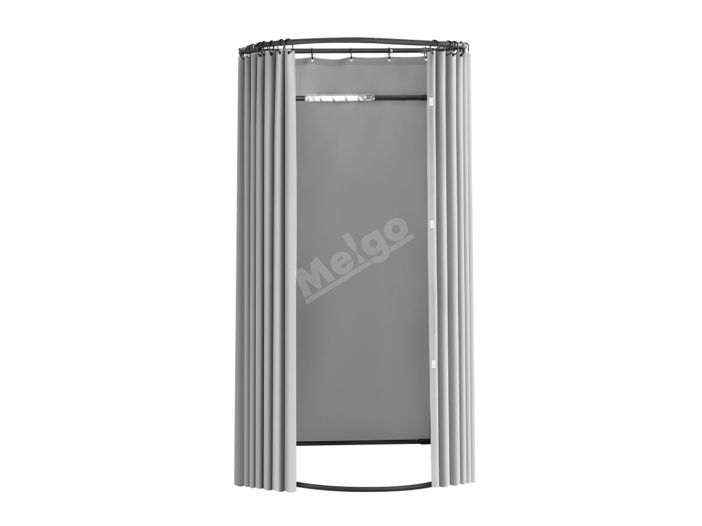 Je vyroben z polyesterové tkaniny, která blokuje světlo, zajišťuje soukromí a je odolná proti pomačkání. Robustní železný rám zajišťuje stabilitu a poskytuje bezpečný prostor pro převlékání, ideální pro obchodní centra, butiky, studia, obchody se svatebními šaty a další.