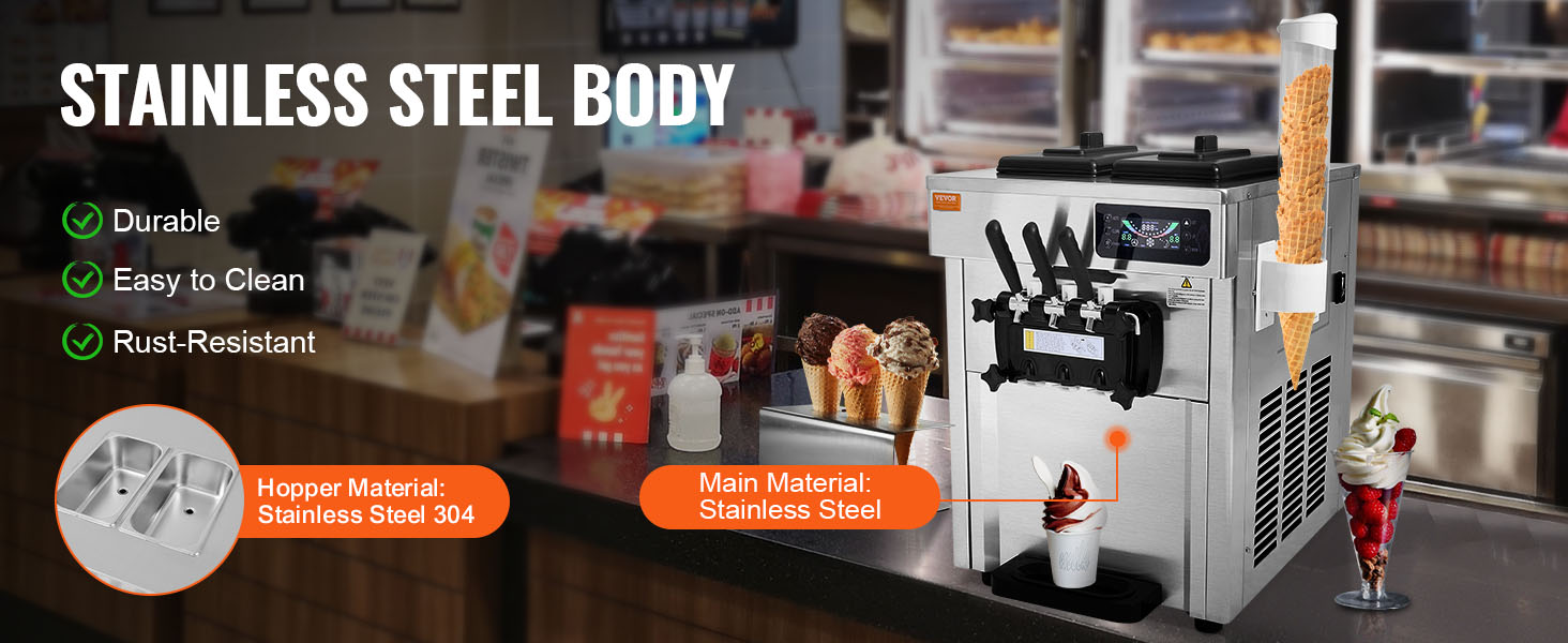 Tento stroj na jemnou zmrzlinu je vyroben z vysoce kvalitní nerezové oceli s válcem z nerezové oceli 304. Je odolný proti korozi, což zajišťuje dlouhou životnost a hygienu v komerčních zařízeních. Snadné čištění: Stačí nalít vodu a stisknutím tlačítka spustit funkci automatického čištění.