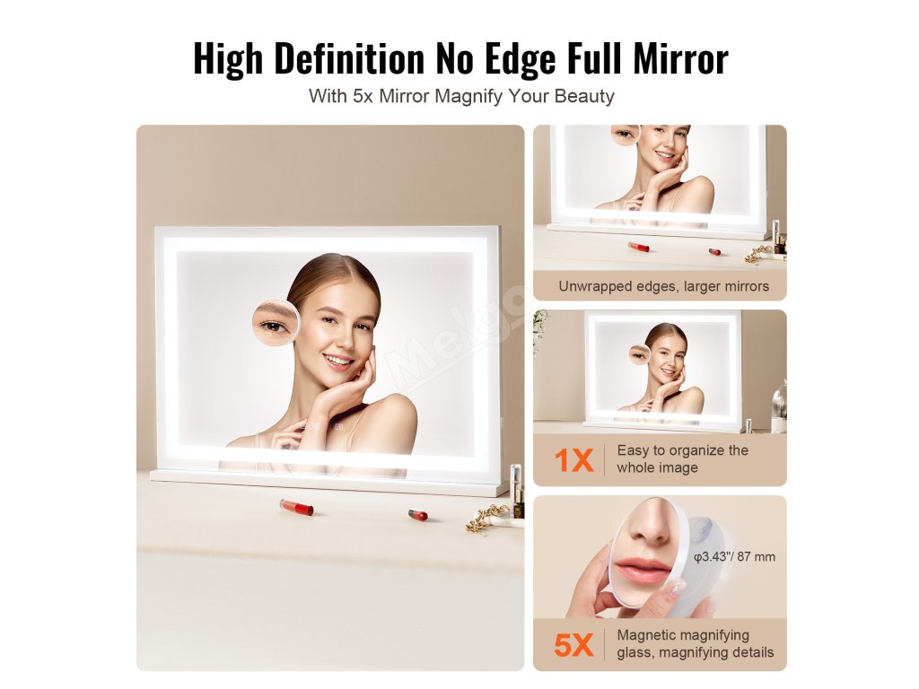 Toto kozmetické zrkadlo s vynikajúcim remeselným spracovaním vám prináša jedinečný zážitok z líčenia. Je vybavené 5-násobnou zväčšovacou šošovkou a dotykovým panelom s nastaviteľným jasom, môžete si vybrať správnu teplotu farieb, čo vám umožní ľahko zachytiť každý detail a vytvoriť nádherný vzhľad líčenia.