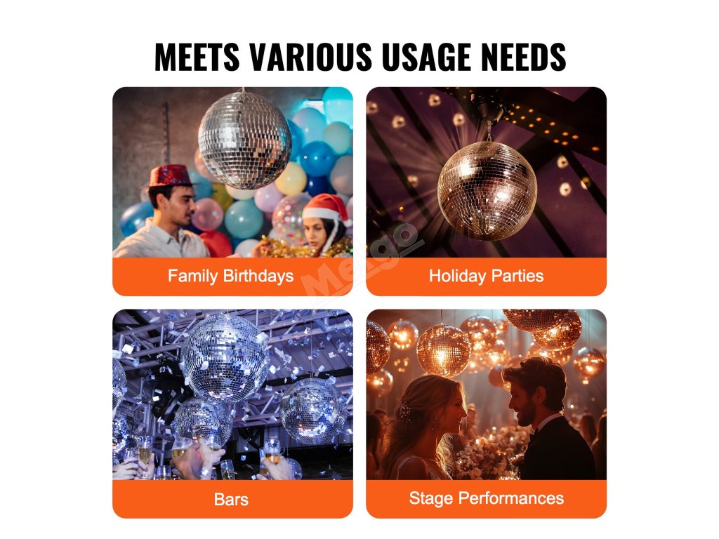 Ať už se jedná o rodinnou oslavu nebo komerční představení, tato zrcadlová diskokoule umocní atmosféru a zvýší vizuální dojem.