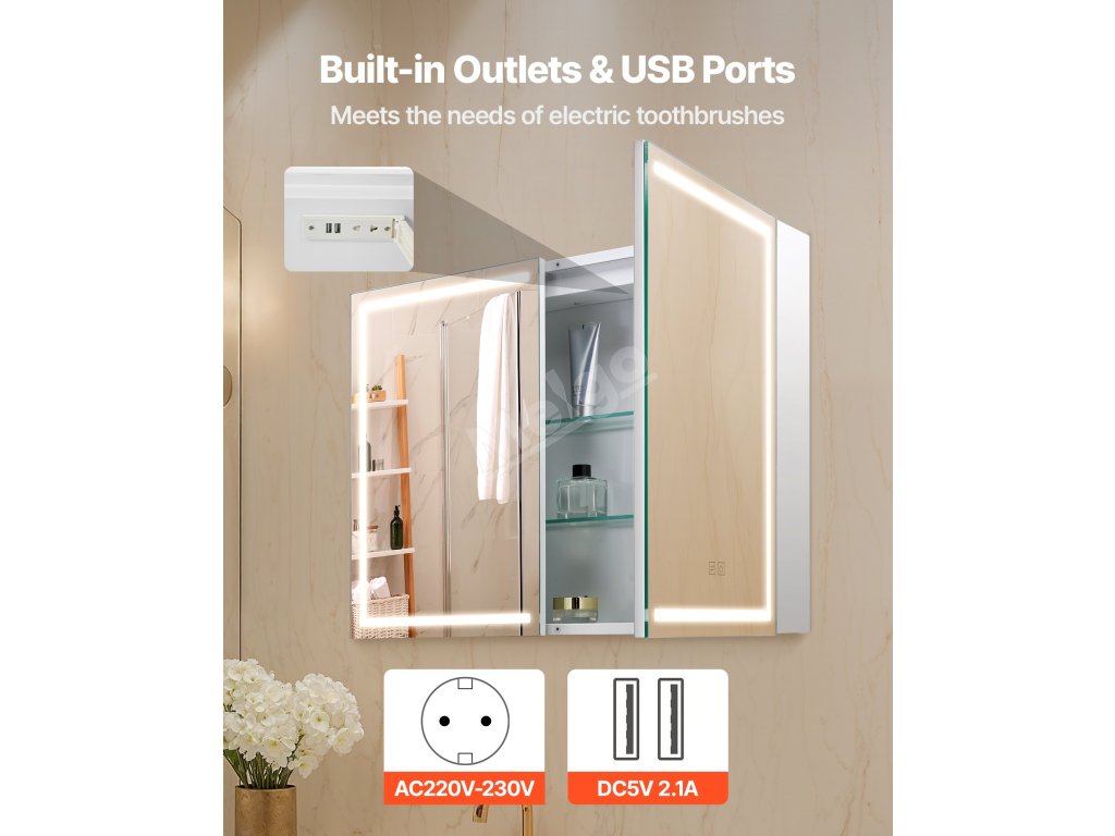 Zrcadlová koupelnová skříňka 60×80 cm, 3-barevné stmívatelné led, usb