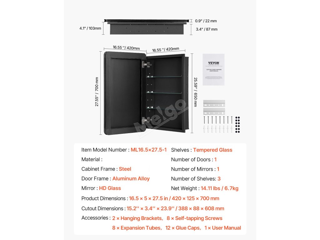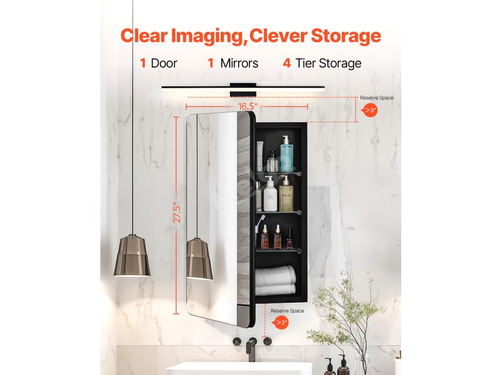 Zrcadlová skříňka 16.5×27.5 inch, 3 police, zapuštěná montáž