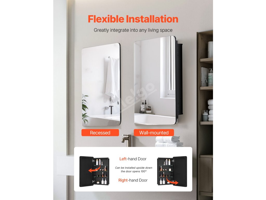 Koupelnová zrcadlová skříňka je určena k montáži na stěnu i k zapuštění do zdi a lze ji otočit pro levé nebo pravé otevírání dveří. Bez námahy se přizpůsobí různým uspořádáním koupelny a poskytuje větší pohodlí podle vašich preferencí.