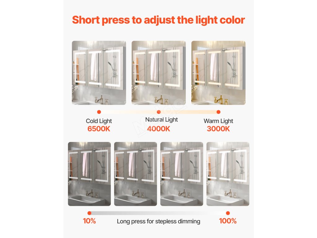 Tato zrcadlová skříňka LED nabízí vysoké světlo pro líčení a nízké teplé světlo pro jemné noční mytí. Paměťová funkce automaticky vyvolá poslední nastavení jasu. Splní vaše potřeby osvětlení v různých denních dobách