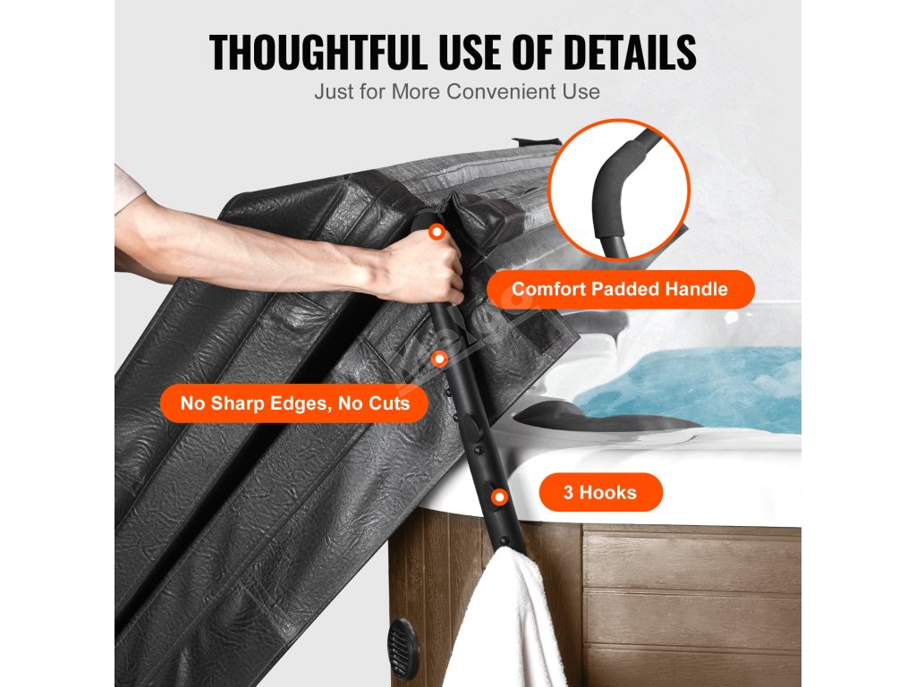 Zdvihák krytu na vírivku VEVOR má niekoľko praktických funkcií. Obsahuje polstrovanie na držiaku na pohodlné uchopenie. Zdvihák je tiež vybavený úpravou proti ostrým hranám. Tá zaručuje, že vás žiadna časť zdviháku nepoškriabe. Okrem toho má zdvihák na svojom držiaku tri háčiky. Tieto háčiky sú ideálne na zavesenie uterákov a oblečenia. Praktický a používateľsky prívetivý dizajn obidvoch zariadení zvýši váš kúpeľný zážitok tým, že vám poskytne väčšie pohodlie. Vďaka premyslenému dizajnu sa neuveriteľne ľahko používa v akejkoľvek kúpeľnej zostave.
