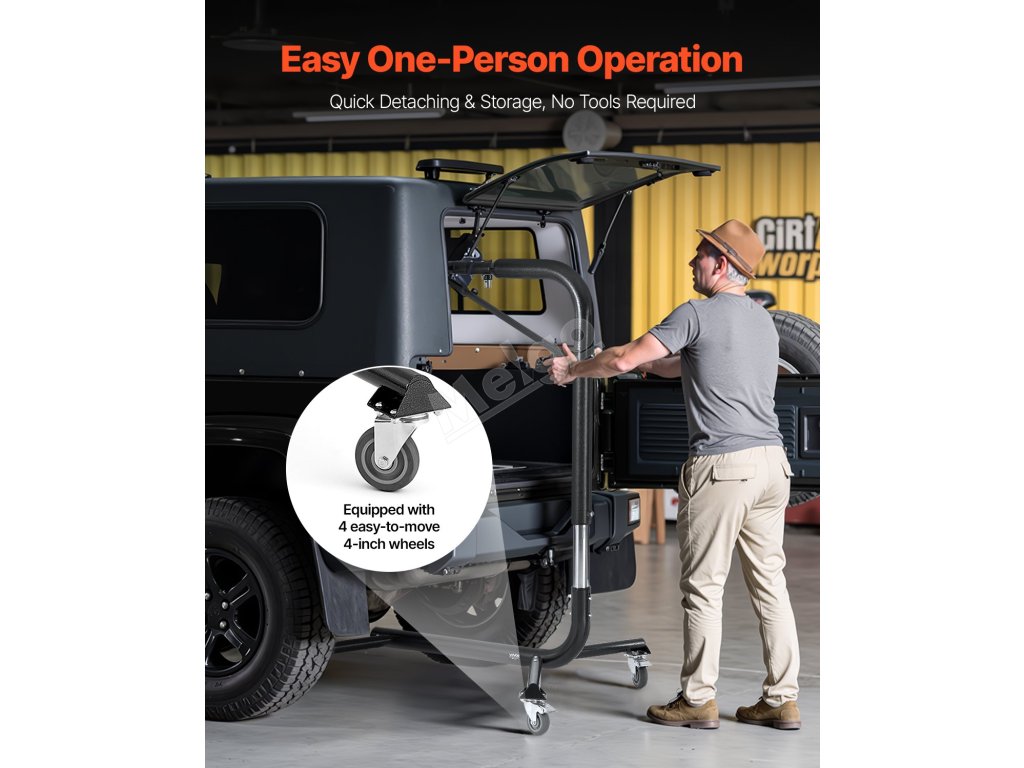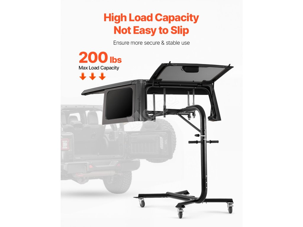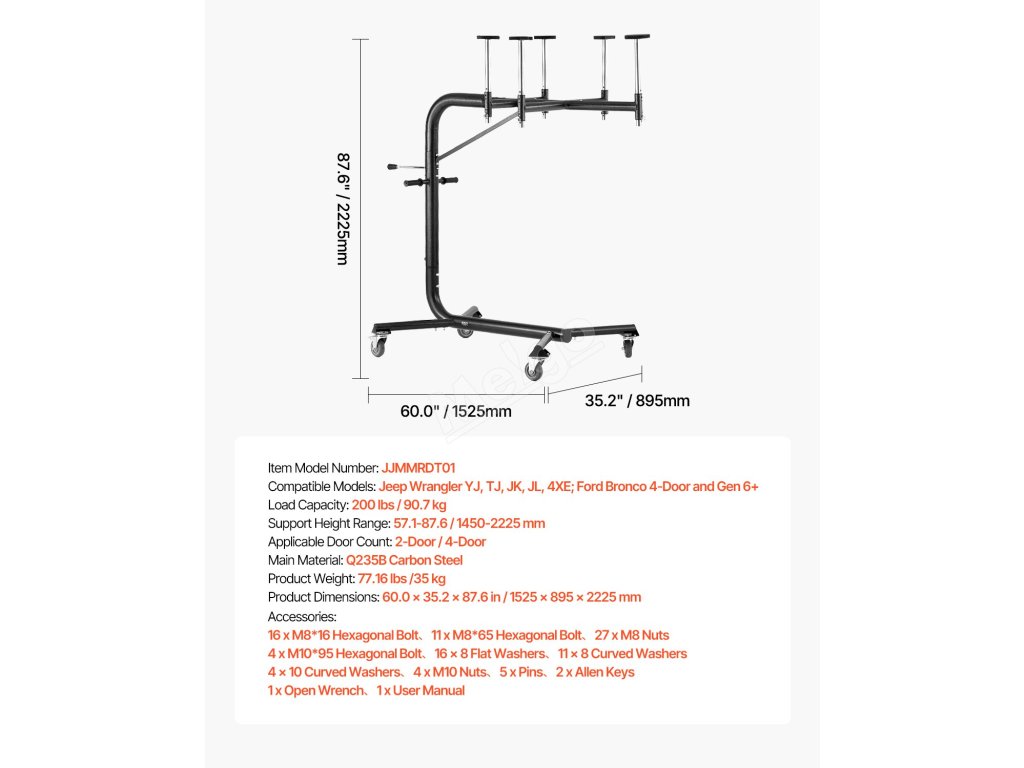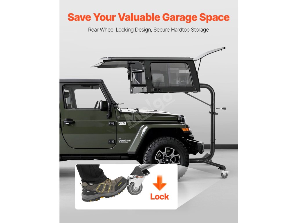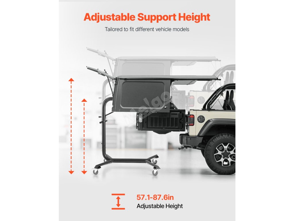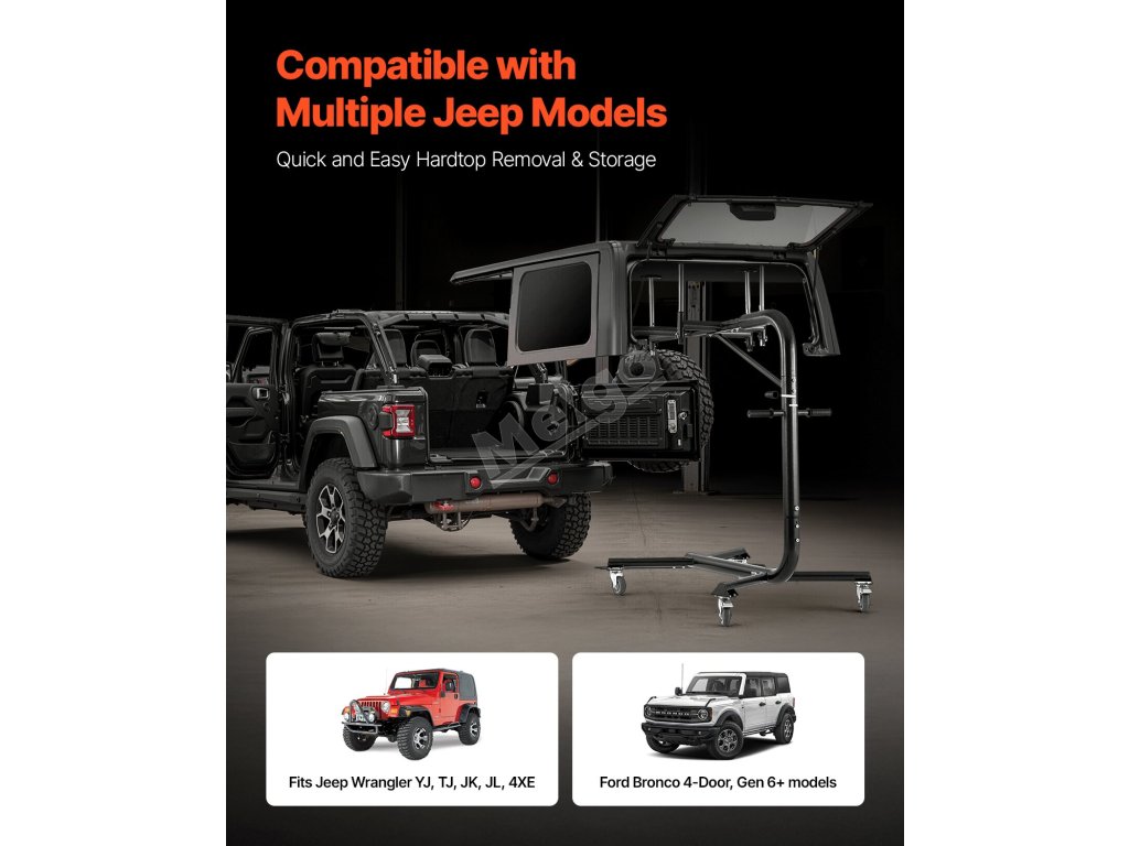Je určen pro modely Jeep Wrangler a Ford Bronco včetně YJ, TJ, JK, JL, 4XE a Ford Bronco (4dveřový a 6. generace+), dokonale se hodí pro dvoudveřové i čtyřdveřové verze. 57.nastavitelná výška 1 až 87,6 palce, nosnost 200 liber, 4 kolečka, díky kterým je skladování v garáži a demontáž pevné střechy hračka!